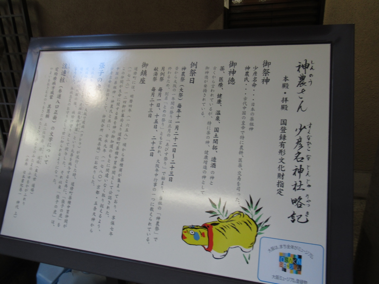 安永9年(1780)、以前から薬種商達が道修町の仲間会所に祀っていた神農氏と京都五條天神社より少彦名命の分霊を勧請して合祀したのが始まりとされているそうです。