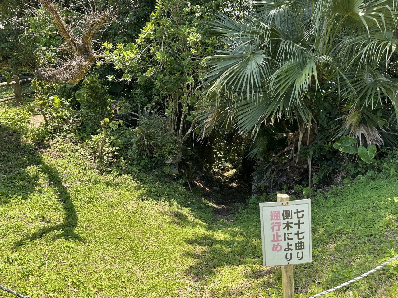 百之台公園から南へ1キロのところ、標高200mの百之台地から海岸の方(阿伝集落)へ向かって急峻な細い坂道があります。これが七十七曲りと呼ばれている道で、昭和30年代までは生活のための道で、百之台の高台を迂回すると時間がかかるため、この急な坂道を通って、百之台の反対側に抜けていました。最近まではトレッキングコースとなっていましたが、今は台風での倒木のために、通行止めになっています。