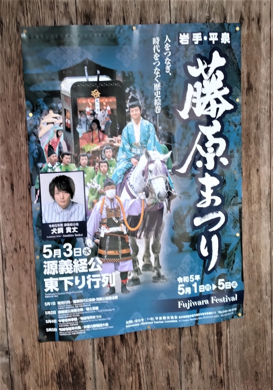 5月1日から5日までの5日間平泉町で開催される奥州藤原氏の祭り。中尊寺や毛越寺で藤原四代の追善法要、稚児行列や郷土芸能、能や狂言の奉納が行われる。特に有名なのがの5月3日に開催される「源義経公東下り行列」で、今年(2023年)のポスターを中尊寺境内で見かけた。