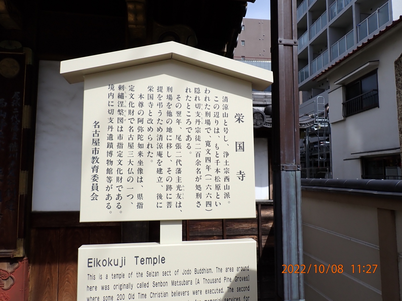 名古屋市観光で立ち寄りました。清涼山「栄国寺」は、真宗大谷派 名古屋別院から北に数分のところにある浄土宗西山派のお寺です。昔は千本松原という処刑場で隠れキリシタンが200名以上処刑された場所だそうです。その後、処刑場は移され、菩提を弔うための清涼庵が建てられ、後に栄国寺と改められたとのことです。