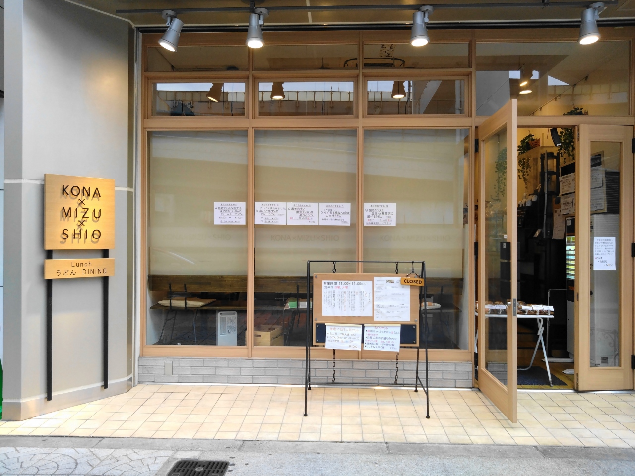 堺筋本町にある「うどんダイニングKONA×MIZU×SHIO(粉×水×塩)」さん、お洒落で洗練された雰囲気の外観が素敵です。