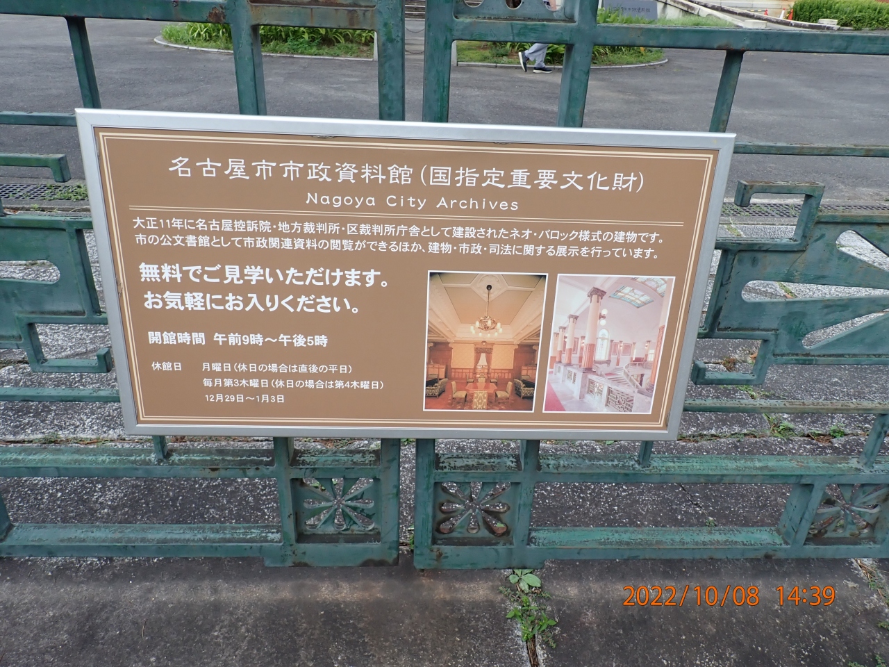 名古屋市観光で立ち寄りました。名古屋市市政資料館は、久屋大通公園の北の端から更に10分弱歩いた所にありました。入り口に名城公園の表示があったのにはびっくりしました。建物は、迫力があり豪華な外観でした。国の重要文化財に指定されており、ネオバロック様式の建物だそうです。内部は無料で見学できるようになっており、昔の裁判の風景を見ることも出来ます。