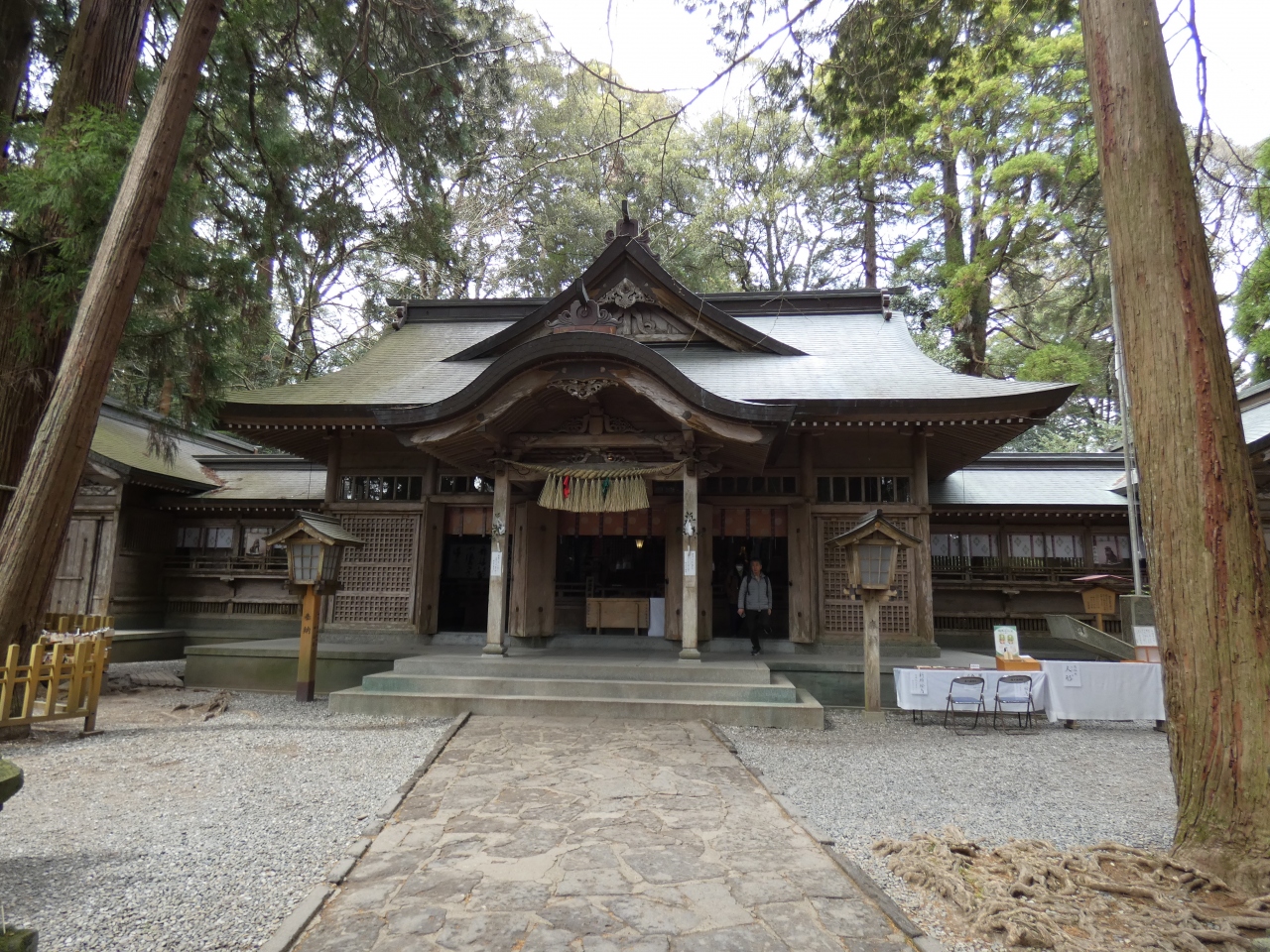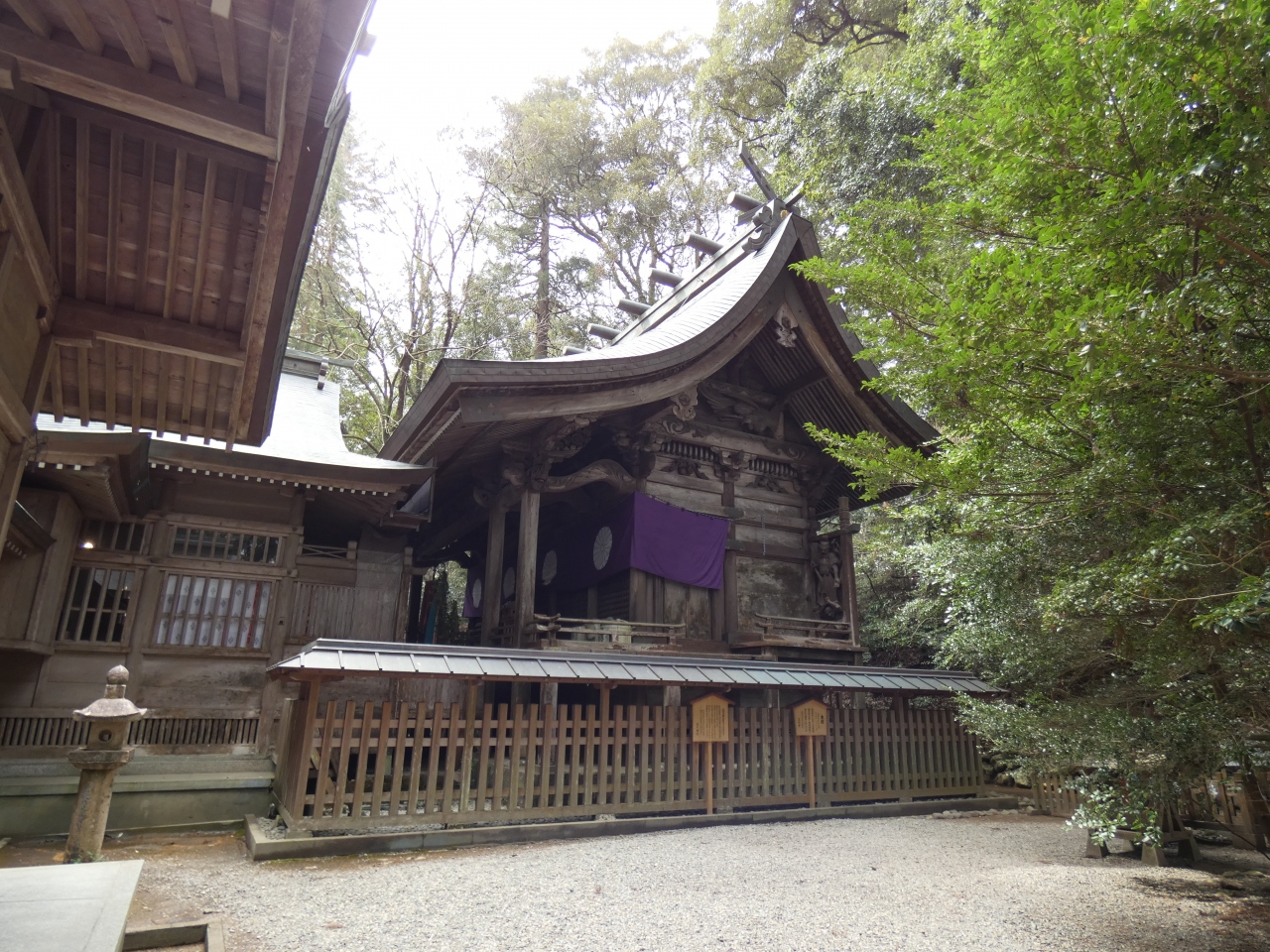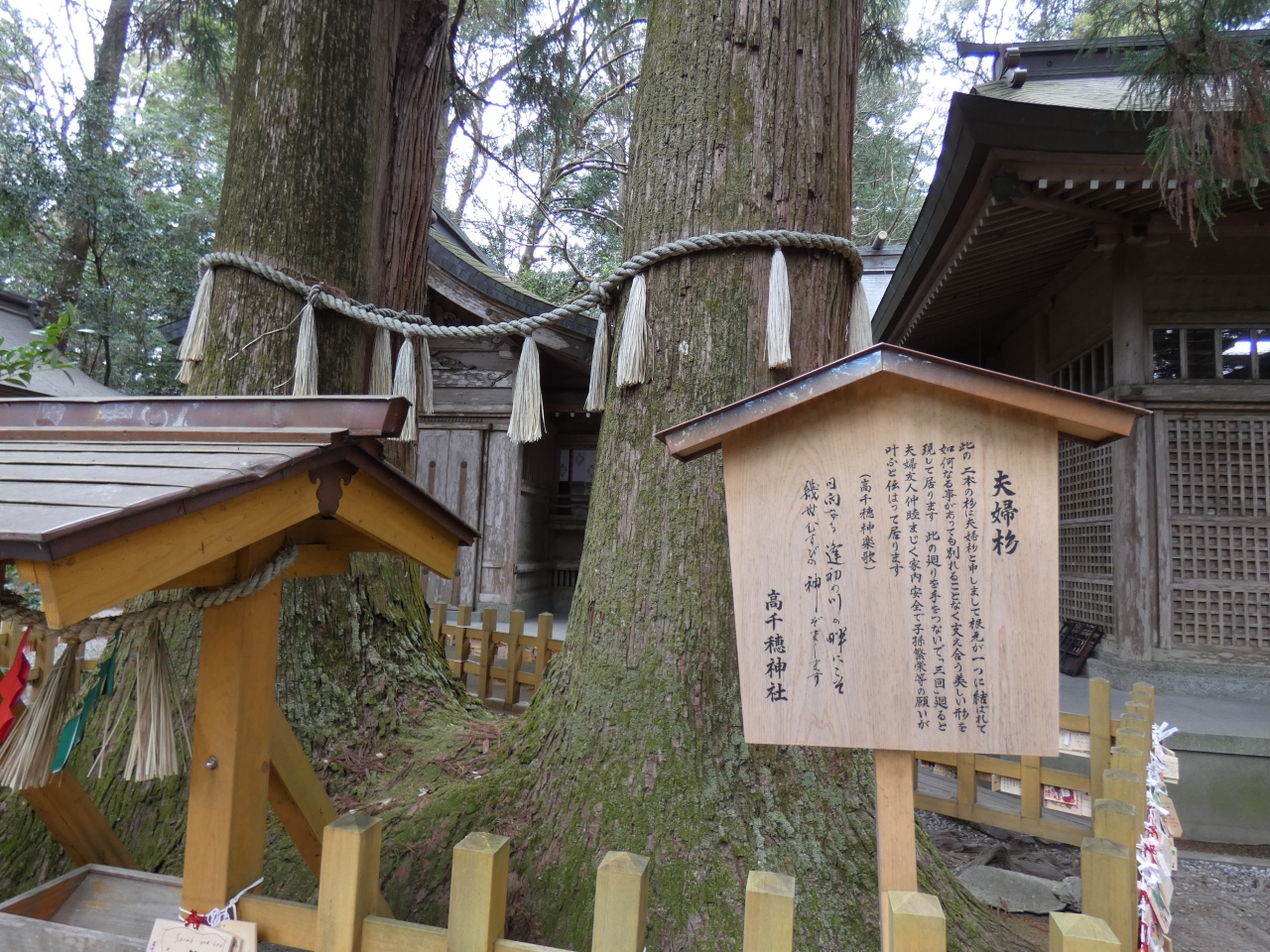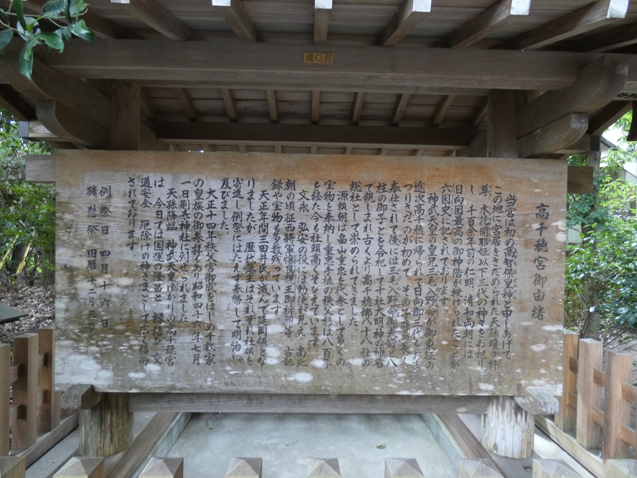 国道50号線沿い高千穂町三田井交差点角に鎮座する神社。人気の高千穂峡の入口にあたります。国史見在社の有力な論社ですが社格制度上は村社にとどまった、現在は神社本庁の別表神社となっています。主祭神は一之御殿の高千穂皇神と二之御殿の十社大明神。日本神話の日向三代と称される皇祖神とその配偶神の総称、十社大明神は神武天皇の皇兄・三毛入野命とその妻子神9柱の総称です。第11代垂仁天皇の創建と伝わり、高千穂18郷188社の総社です。境内には樹齢800年の秩父杉を始め大木が繁り、荘厳な雰囲気が漂います。