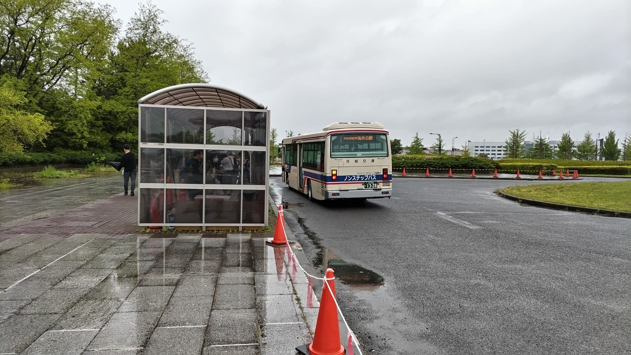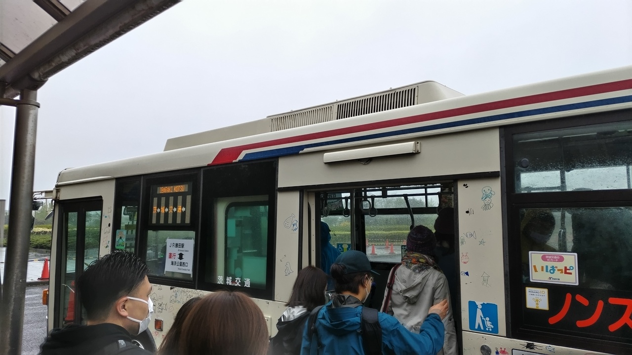 Suicaなどの一般的なICが使えず、ローカルなICカードのみの扱いで、久しぶりに現金でバス賃を支払った。バスは一般的な路線バスで、特に特徴はない。水戸駅前のバス乗り場の案内が乏しく、もう少し案内を詳しく書いて欲しいと思った。