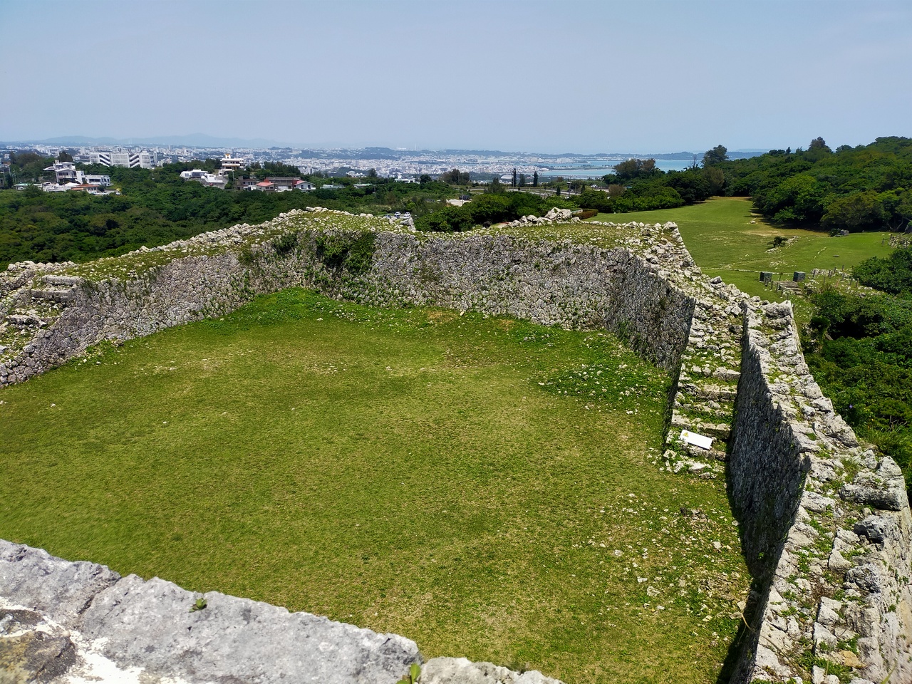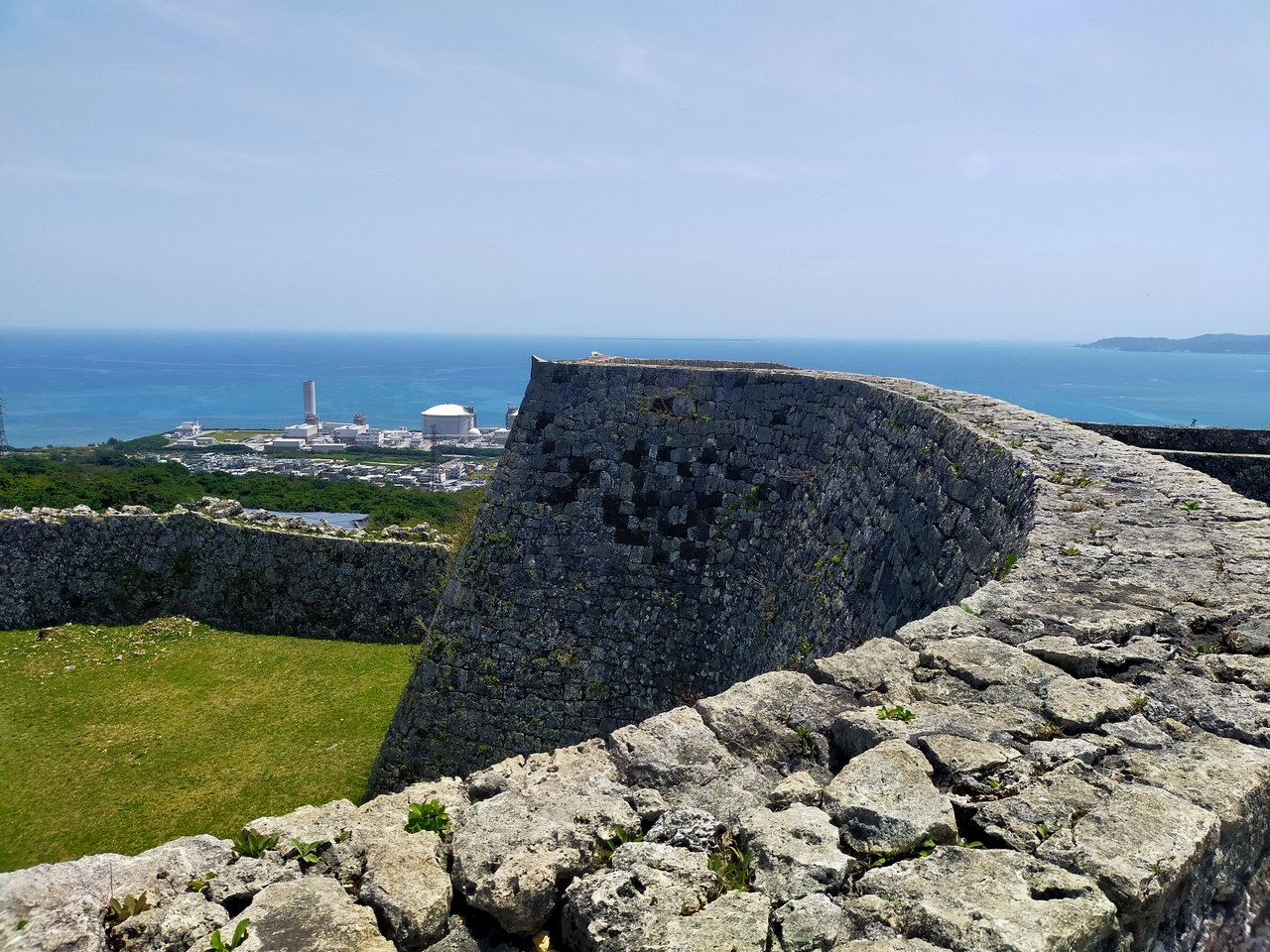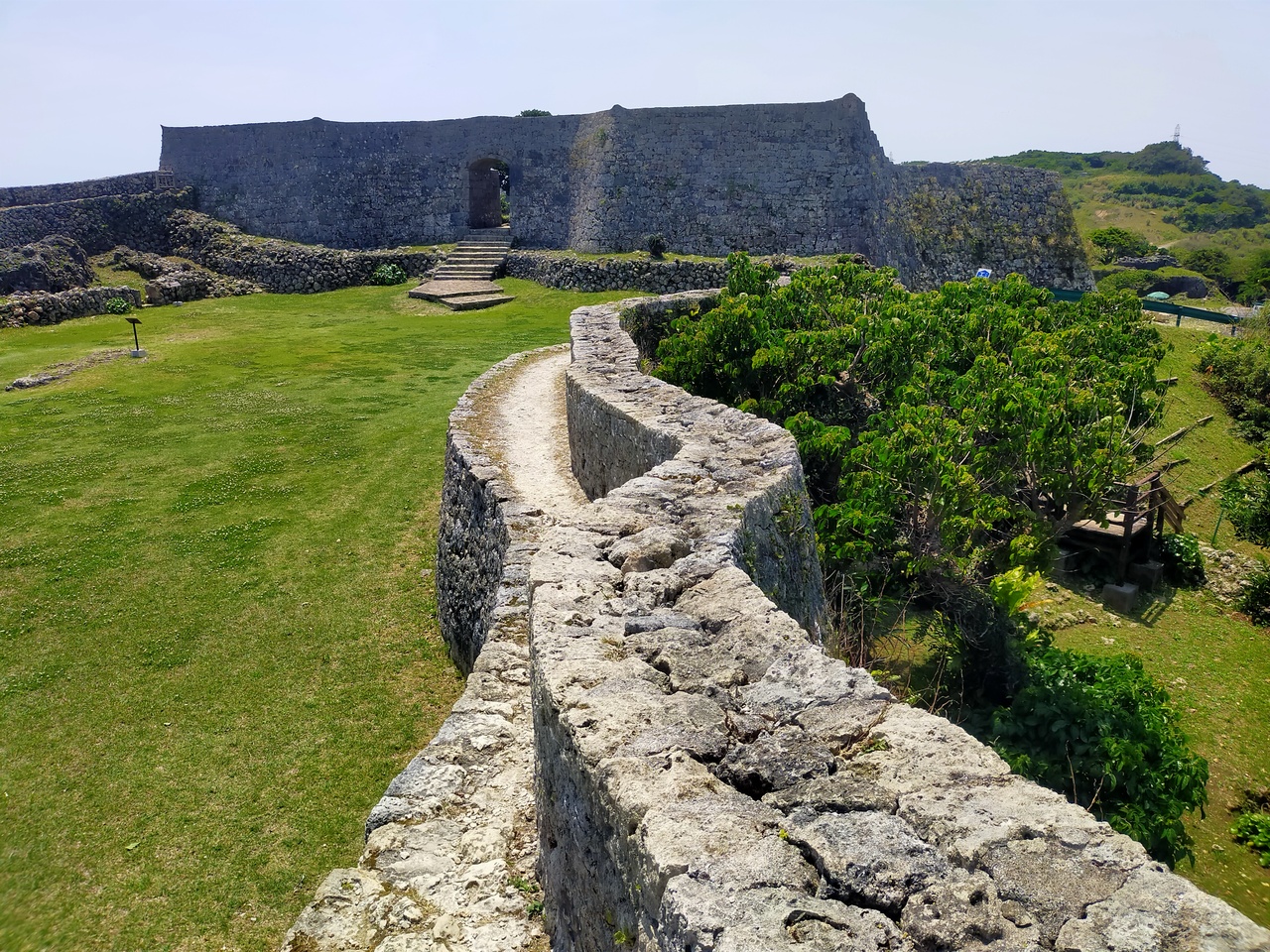 のカートでグスクの入口まで連れて行ってくれました。結構坂になっているので、ありがたかったです。城内に入ると、まずサンゴで作られた石垣の広大さに圧倒されます。加工して積み上げて連ねて。よくこんな広い土地に石垣を張り巡らせたなという驚きがあります。高いところから石垣を見渡すと、波打つ石垣が美しいのと、しっかり城郭として攻めにくさをになっていることに感動します。とても良かったです。