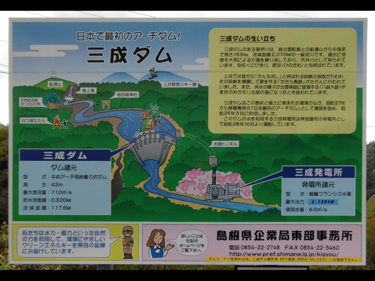 島根県奥出雲町の船通山から中海まで、長さ153㎞の斐伊川が流れている。奥出雲町三成に日本で最初の本格的アーチダム、砂防と発電を目的とする三成ダムが昭和29年に完成した。斐伊川の上流では昔から「かんな流し」で砂鉄が採取され「たたら製鉄」が行われてきた。また、たびたび起こる斐伊川の氾濫が出雲神話「八岐大蛇」のもとになったともいわれている。国道314号から100mあまり南に登ったところに駐車場があり、ここからダムを眼下に見ることができるが、堰堤までは進入禁止になっていた。堰堤の下に貯まった水は赤茶色だったが、おそらくこれは鉄分の影響と思われる。