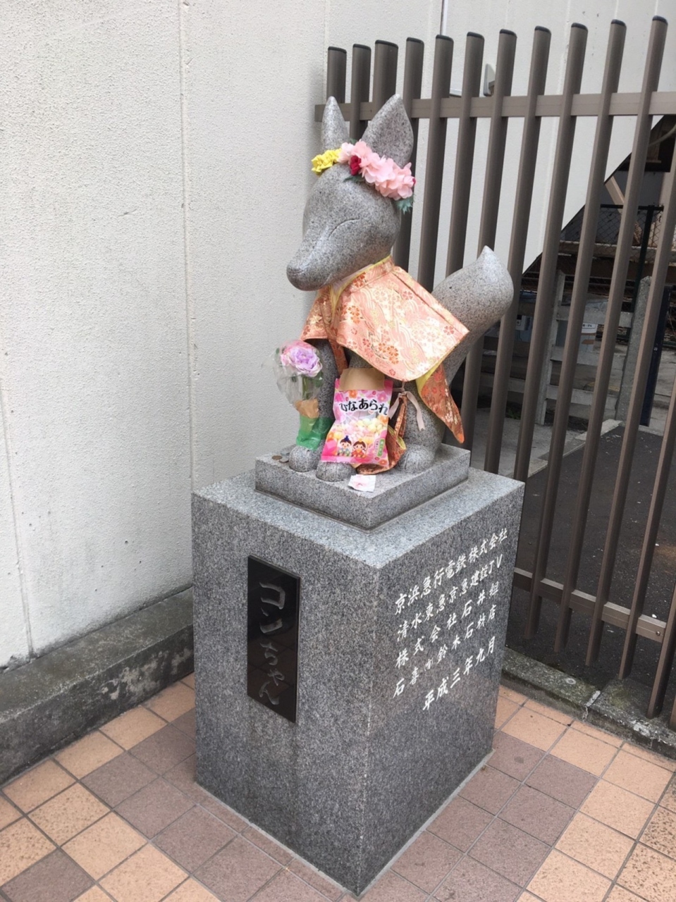 穴守稲荷駅の改札をでて右側を見ると、最初にお迎えしてくれるのがコンちゃんです。地域の方からも大切にされて愛されているのが見てすぐにわかりました。3月だったのでひなまつりらしいお洋服とお供え物がありました。季節によって変わるそうです。