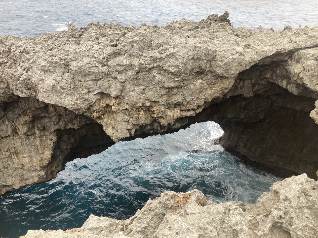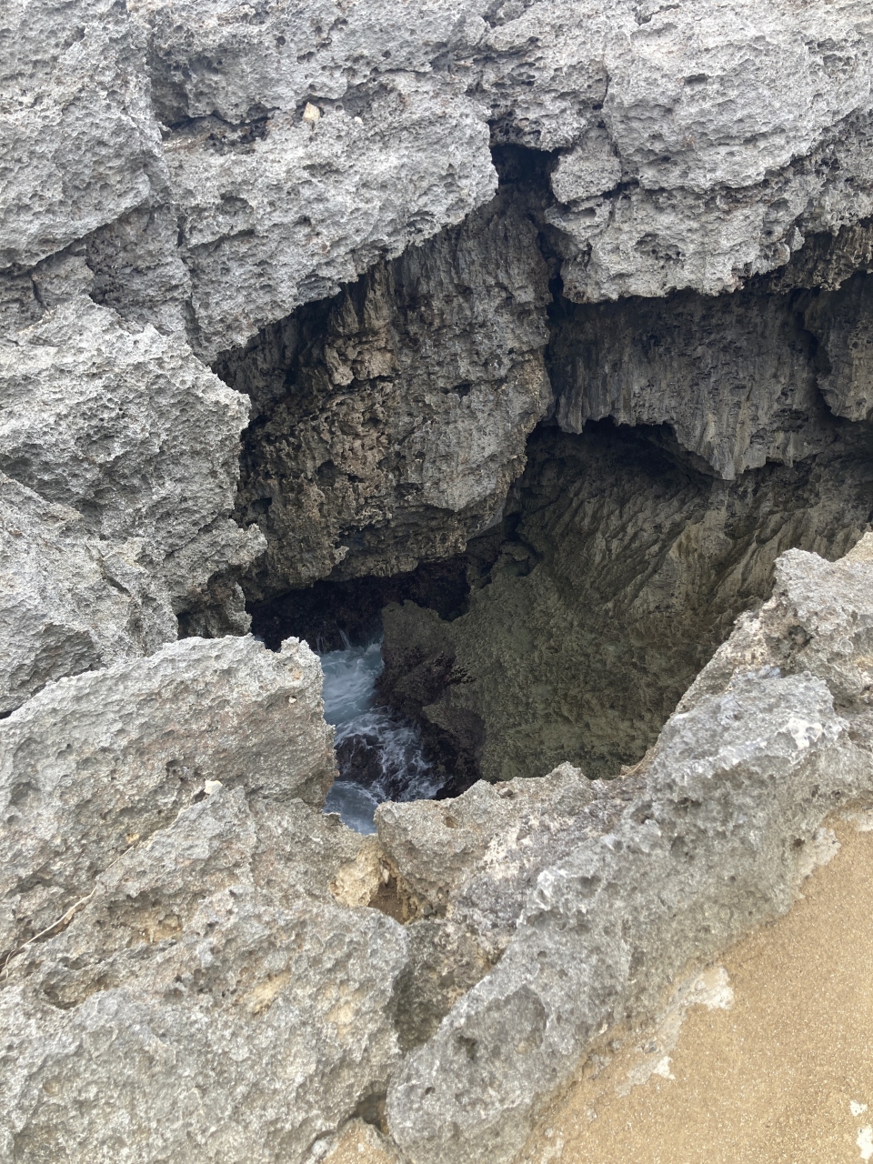穴から見える海は緑で波も高く、結構怖いです。