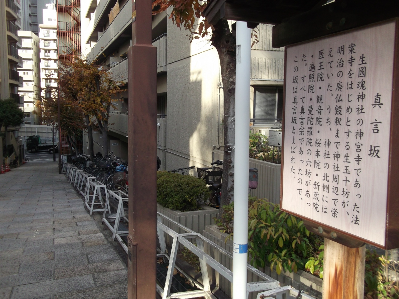 地下鉄谷町九丁目駅から千日前通を日本橋方向に歩いて4分ほど、生國魂神社の門前につながる坂道です。長さは80メートルほどと長くはありませんが勾配は結構あります。かつて真言宗の寺院が並んで建っていたのでこの名前になったようですが、現在は両側はマンションになっています。