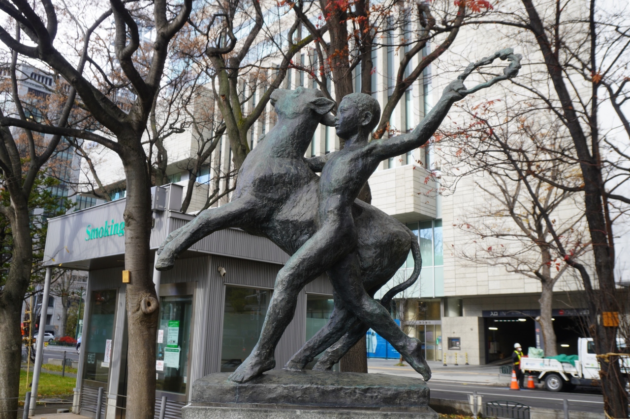 牧童の像は、武蔵野美術大学の峯孝の作品。牧童と子牛が仲良く理想に向かって走る姿。北海道酪農協会が牛乳生産100万石突破記念として、乳牛に感謝の気持ちを込めて建立したというもの。終戦後の札幌大通公園に建立された彫刻の第1号でもあるようです。