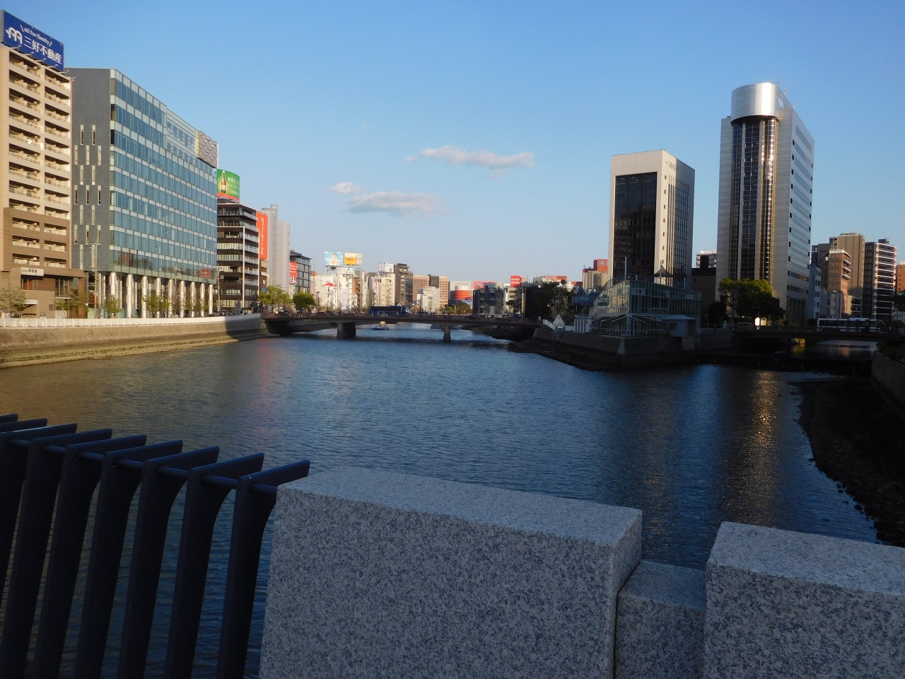 中洲川端から天神方面へ向かって歩いている途中、「那珂川」を渡りました。中州を形成している川で、対岸にはビルが立ち並び、リバークルーズや、中州はかた舟も運行しているようでした。夜になるとネオンが輝いて、博多らしい光景が見られることでも有名です。まだ夕方の時間帯でしたが、ゆっくり時間が流れるような感じの景色でした。