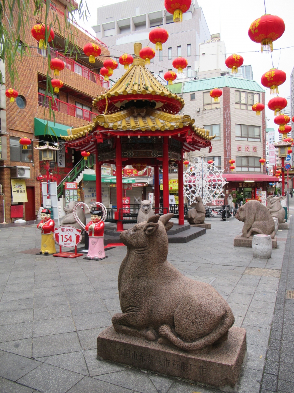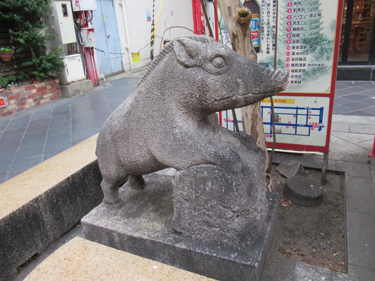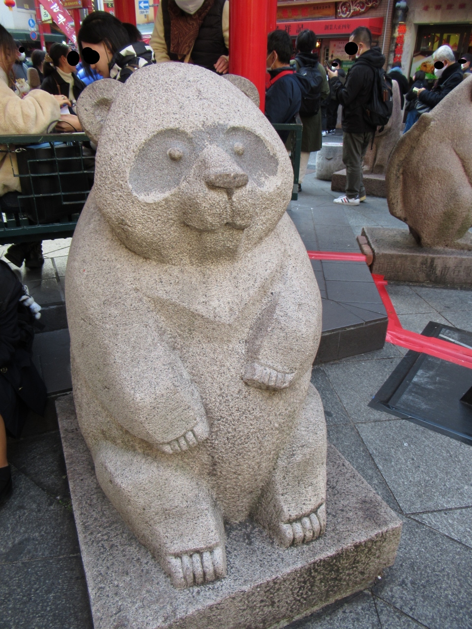 この干支の石像は中国で製作されたものですが、中国の十二支の「亥(猪)」は、「豚」を指すそうで、「イノシシ」が分かってもらえず、なぜか「パンダ」が送られてきたそうです。