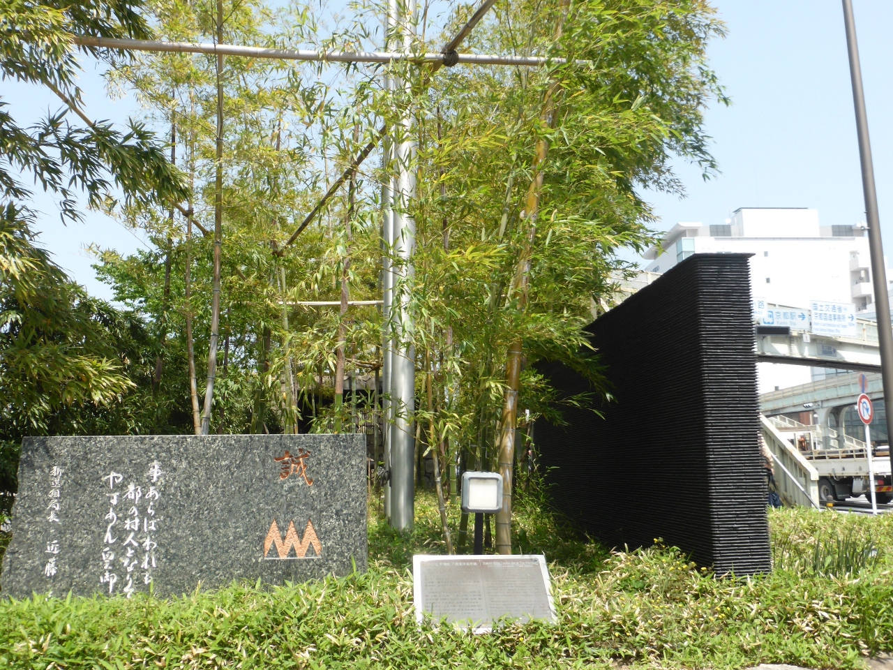 堀川通と塩小路通の交差点に「リーガロイヤルホテル京都」があります。その入り口付近に「誠」の旗印が目立つ「新選組 不動堂村屯所跡」の石碑と案内板があります。慶応3年(1867)西本願寺から不動堂村へ移転し、伏見奉行所へ引き払うまでの6ヵ月間、屯所として使用されたそうです。
