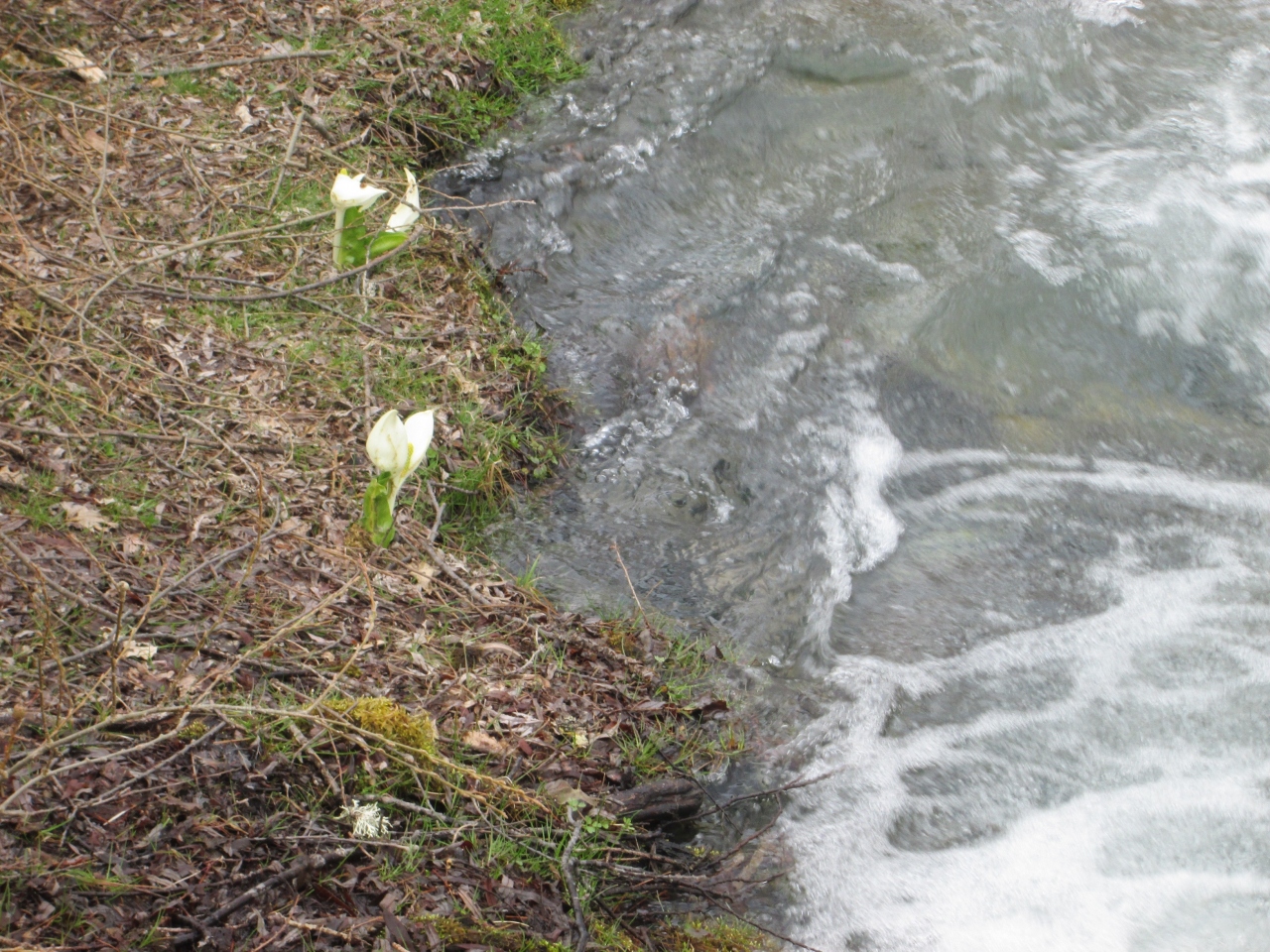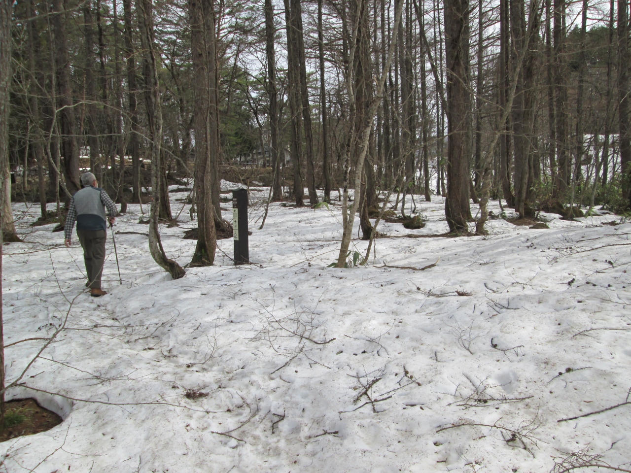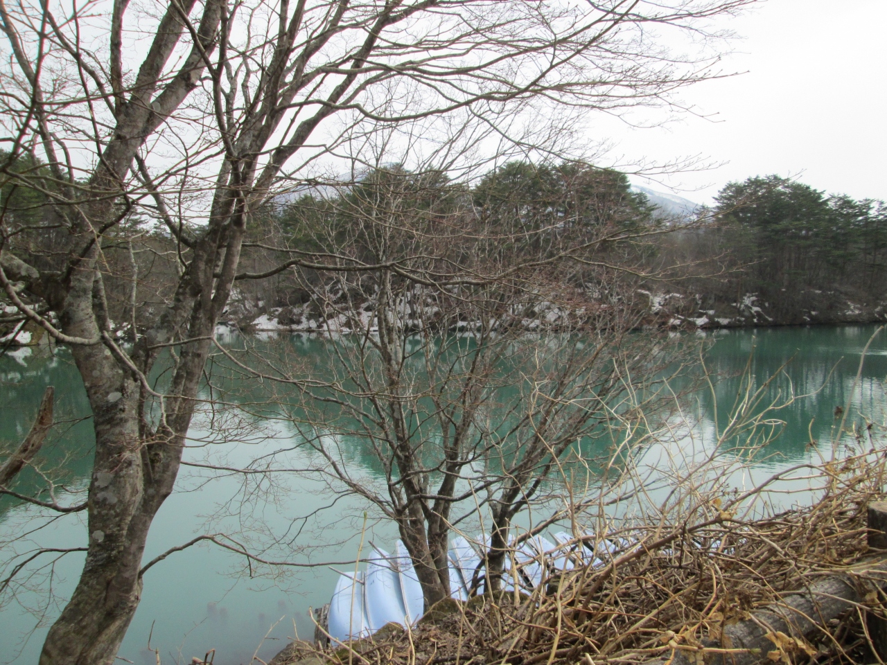 桧原湖畔探勝路や五色沼探勝路を歩く予定でしたが、残雪が多くて歩けず、五色沼群で毘沙門沼の雪が少なかったので、売店付近の探勝路(盤鏡園プロムナード)を歩きました。毘沙門沼は桧原湖と小野川湖との間にある周囲700Mほどの五色沼群の中の小さな沼の一つです。雪解けしたばかりですので、地面に咲く野花は全くなくフキノトウと水辺のミズバショウ2輪を見るのみでした。収穫は展望台から見た磐梯山と吾妻連峰の山容のみでした。ベストシーズンは秋の紅葉のようです