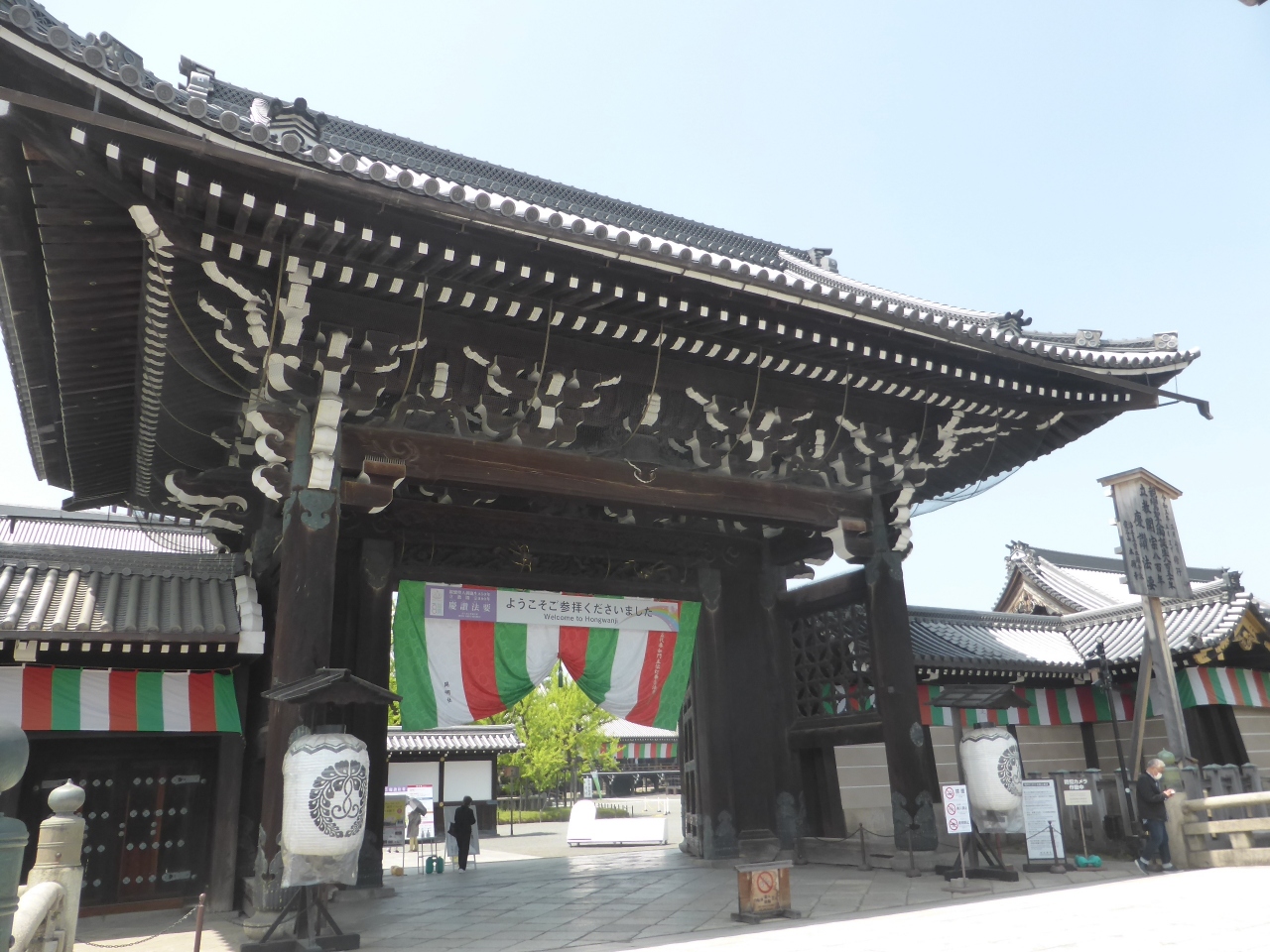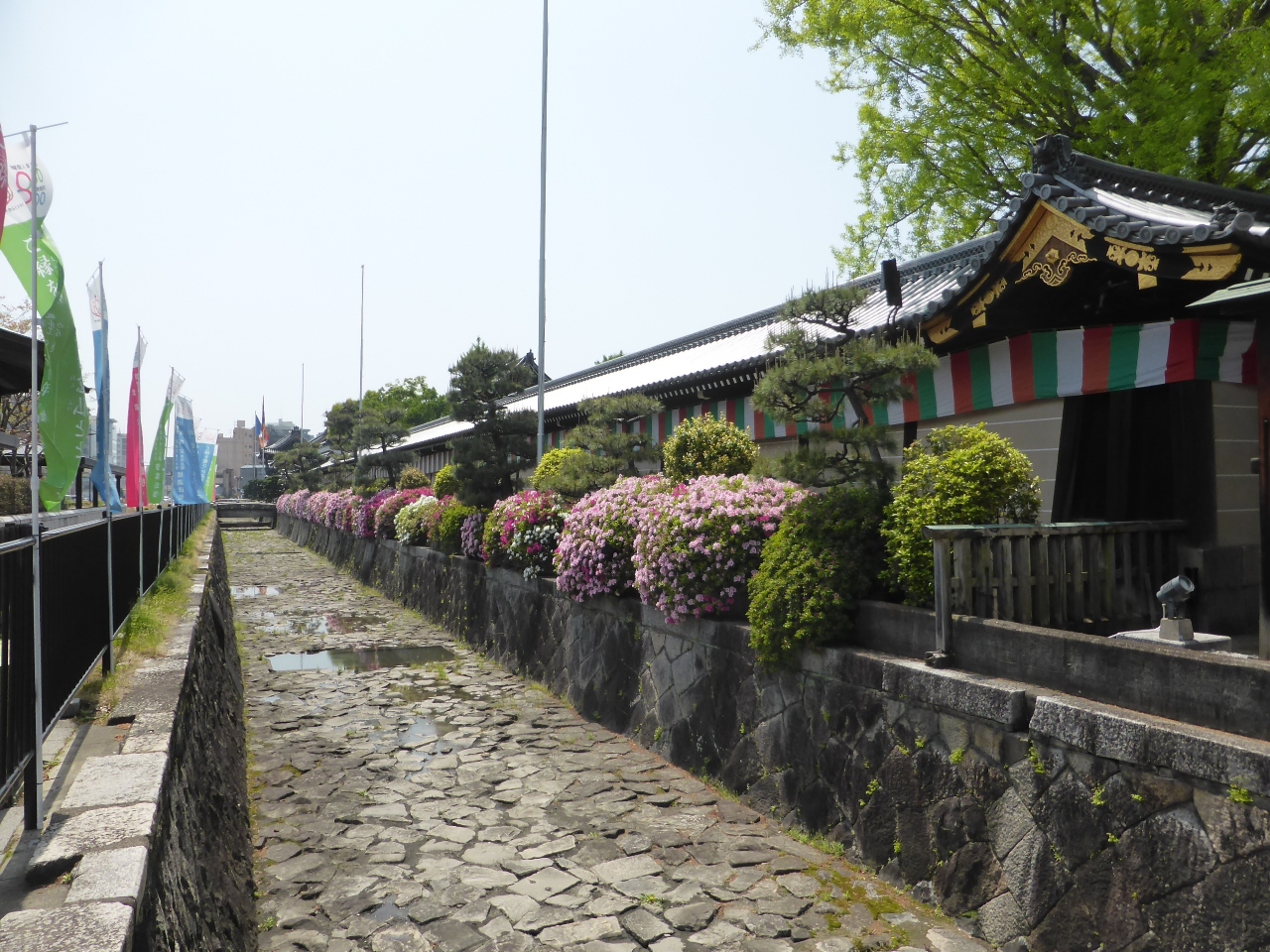 西本願寺(お西さん)は、京都のツツジの名所としても知られています。御影堂門や阿弥陀堂門の並びの東側の土塀やお堀沿い(堀川通沿い)には多くのツツジが植えられています。この時期ならではの風景で、色とりどりのツツジが咲き誇り、雄大な門や風情ある石橋を華やかに彩ります。