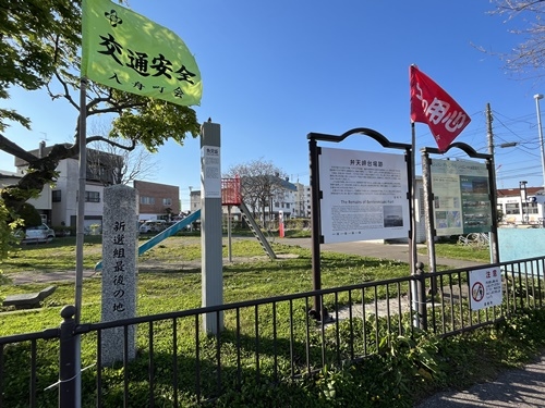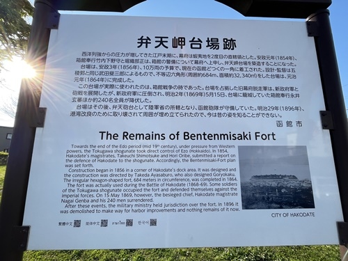 五稜郭と同じ、武田斐三郎の設計ということもあり、箱館の防衛施設としてセットで意識されるべき存在が「弁天台場」です。ただ残念なことに箱館戦争で土方歳三らを含む旧幕府脱走軍の守備陣として使用され、1869年(明治2年)の新政府軍による総攻撃で陥落した歴史を持つばかりでなく、完全に解体され、周囲は埋め立てられてしまったため、当時の雰囲気は皆無です。こうしてしかたなく、というか市電終点・函館どつく前横の児童公園の一角に説明板が立てられているだけでも悲哀を感じます。当時の石垣の一部は入船漁港(函館漁港)の護岸の一部に名残を見つけることができるので、興味のある方は少し足を延ばしてみてもよいかもしれません。
