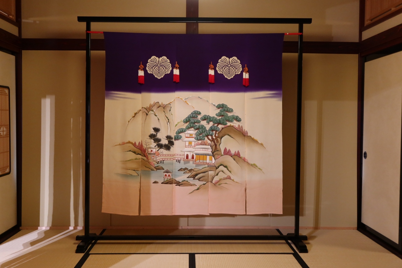 館内は明治から平成までの花嫁暖簾が展示されており、個人的には家紋が蔦、技法が加賀染、生地が綸子、制作年代が大正の「梅と芝垣」が紫と白地に蔦や花が美しく描かれているのが良かったです。
