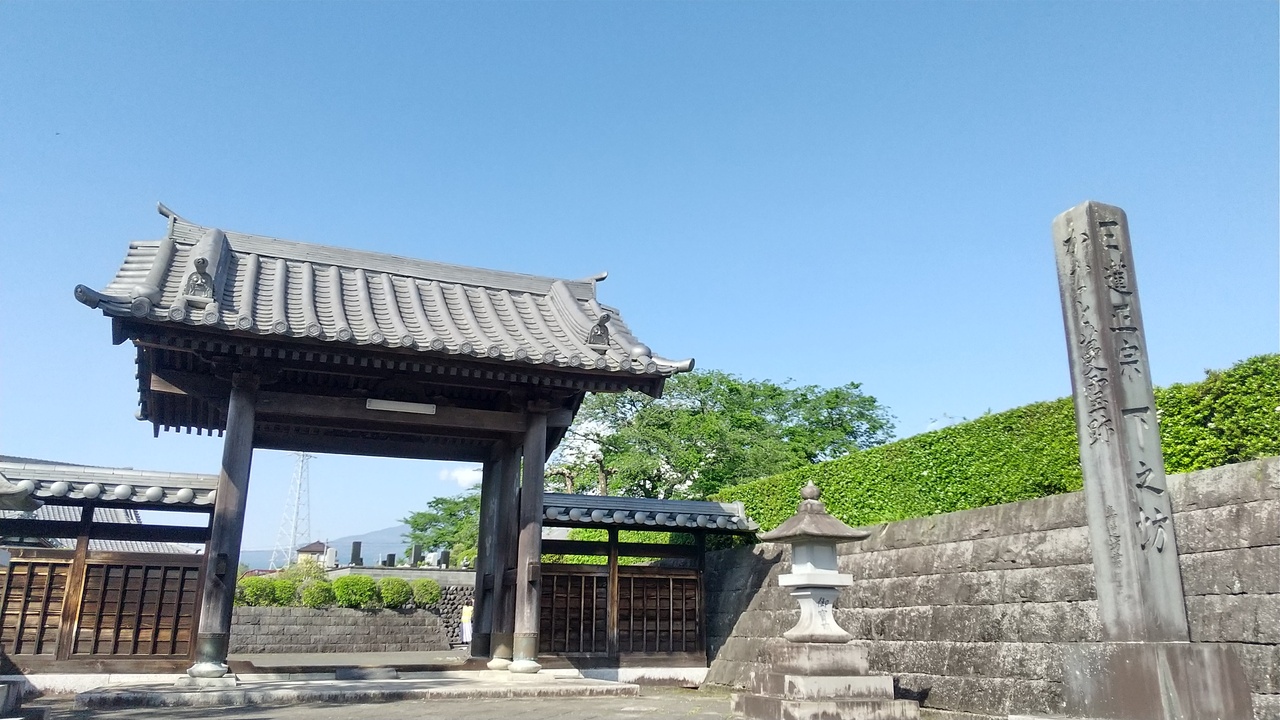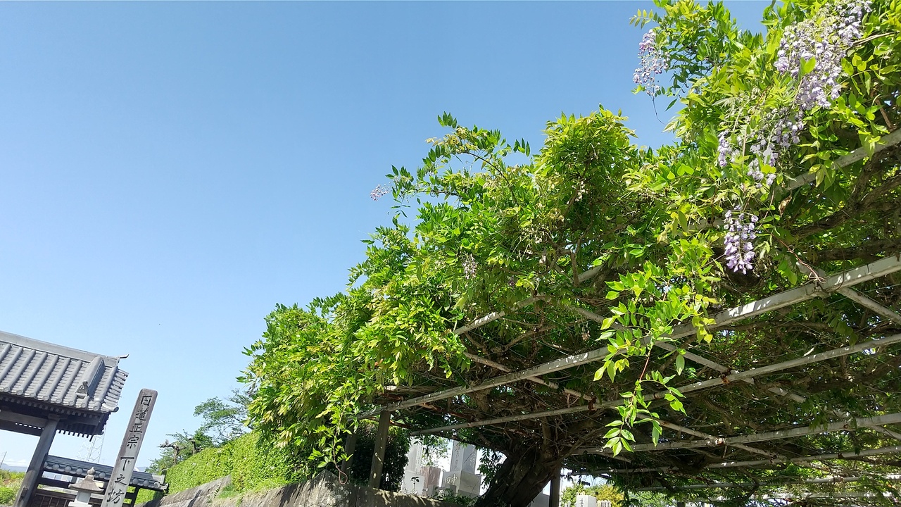 駐車場に沿って藤棚が続き開花の時期は藤の花と富士山が眺められる場所。開花後は墓参で訪れる人のみで静なお寺でした。