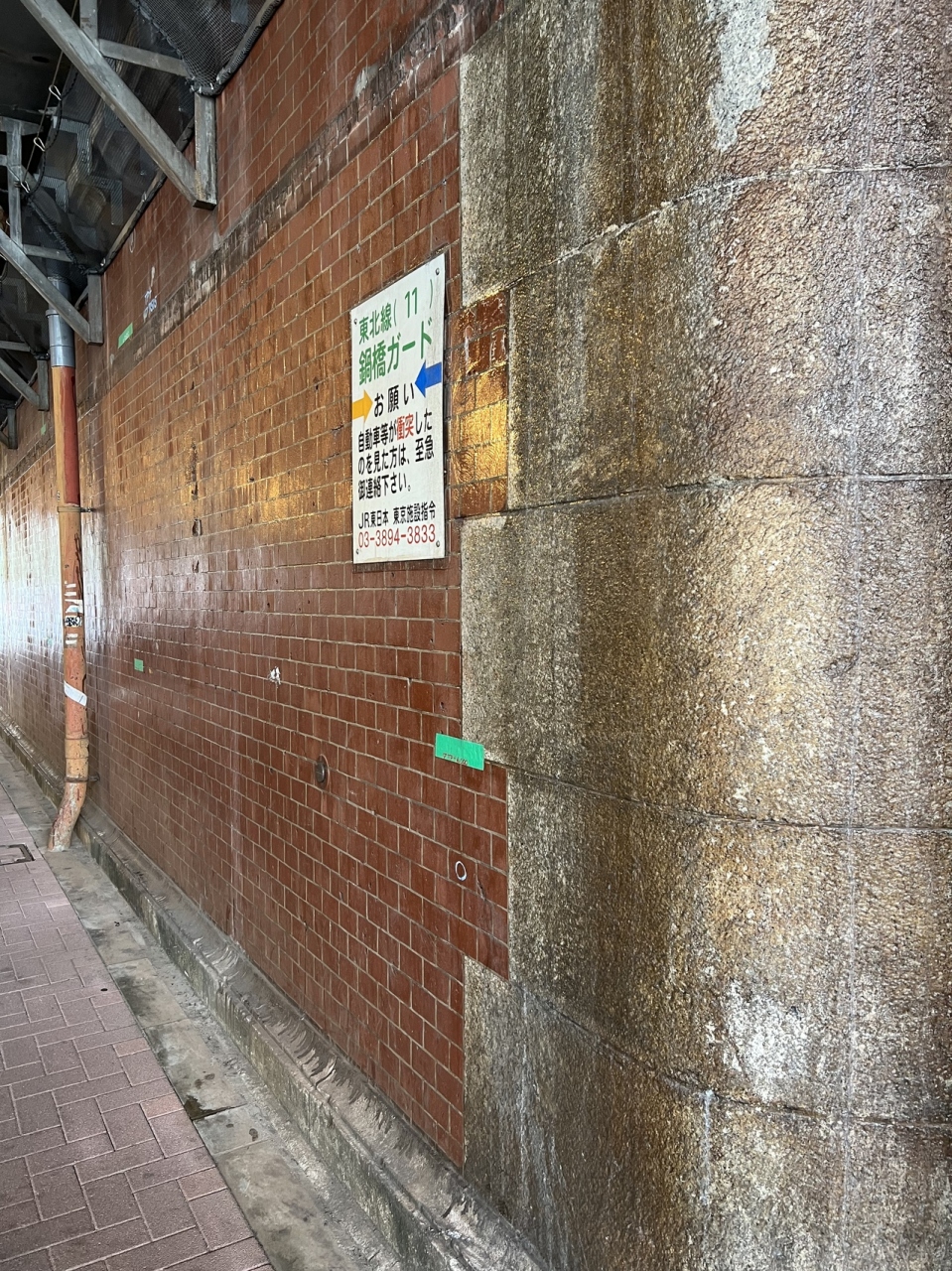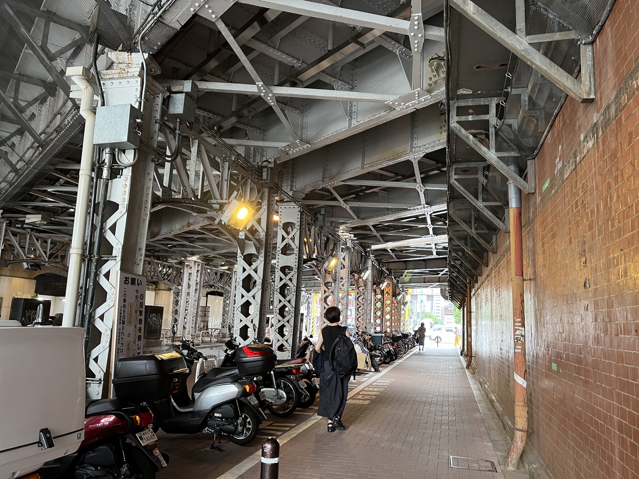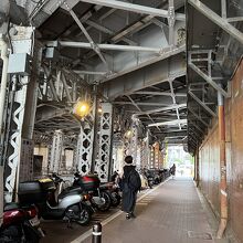 本来は実用的なものなのでしょうが、高架を支える鋼鉄製の柱は、赤レンガとあいまって、見た目にもとてもいい感じでした。高架下の歩道部分は広く取られていますが、一部はバイクなどの置き場になっていました。人通りはそれほど多くなかったです。