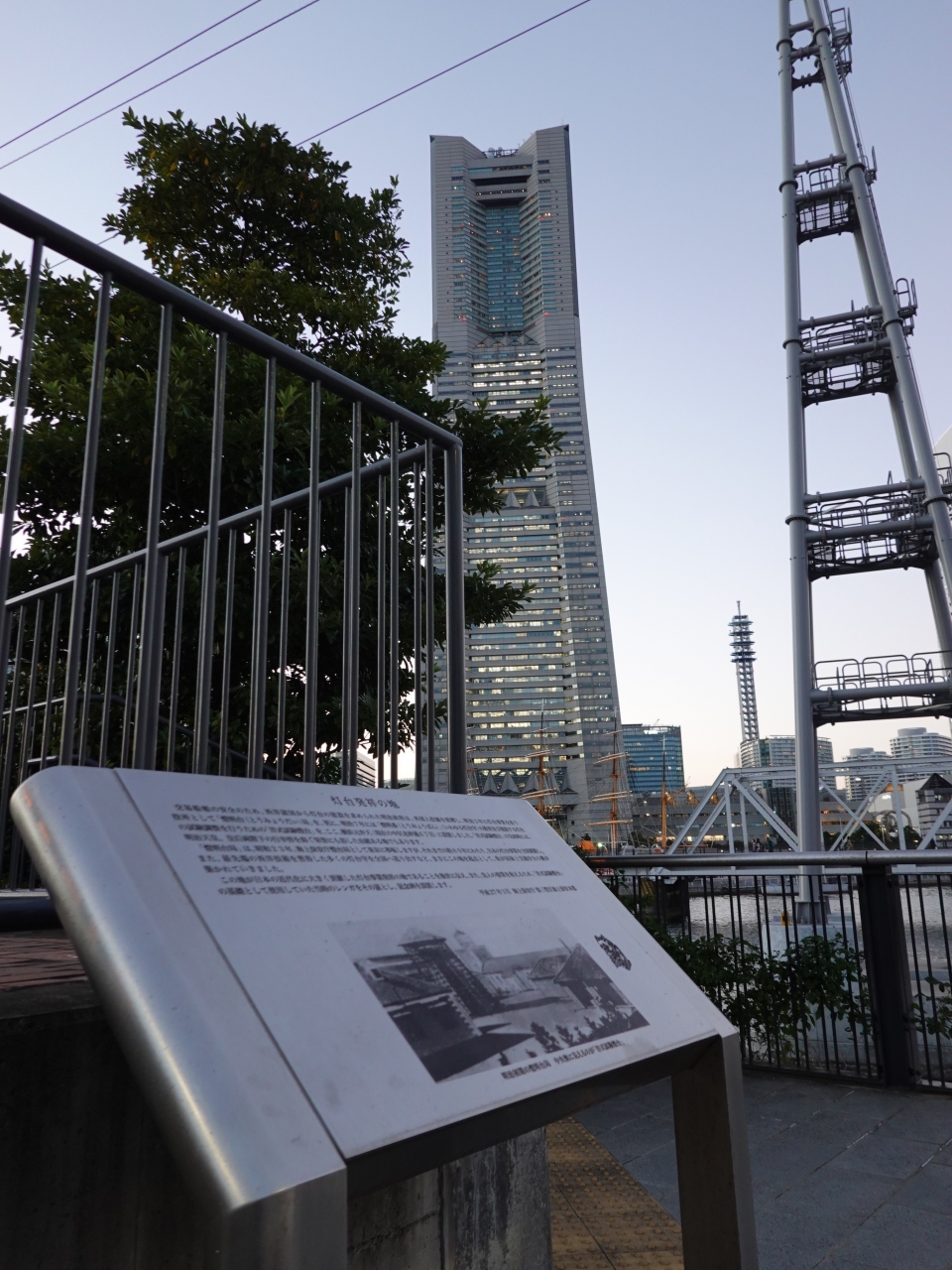 水際線プロムナードを歩いていると、北仲通北第一公園の一画に「灯台発祥の地」と記されたステンレス製の案内板があるのが目に入りました。明治初期のこの場所に灯台が築かれたということですが、現在の周囲の光景からは、この場所に灯台があったということが意外です。