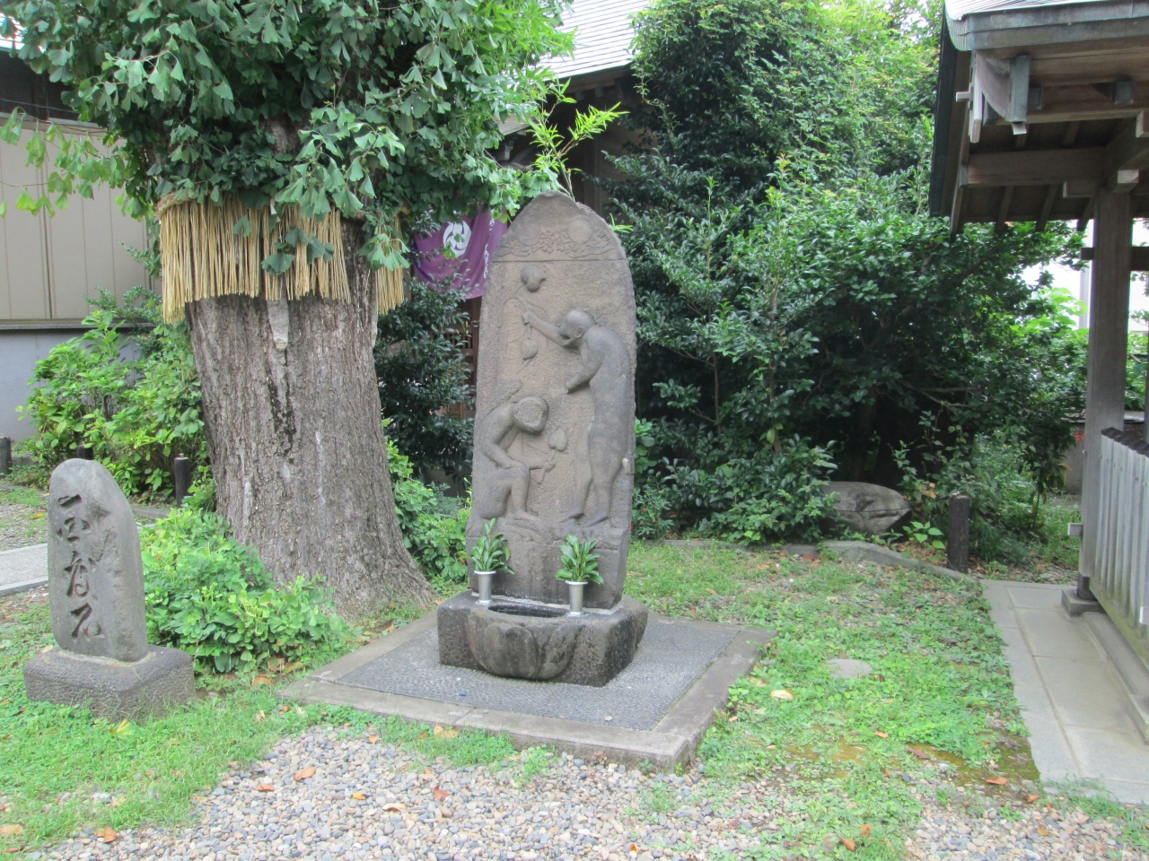 創建は809~823年、ご祭神は応神天皇、神功皇后、仲哀天皇です。石段の途中に区登録有形文化財の鳥居、境内には田村虎蔵顕彰碑、庚申塔、百度石、境内社宮比神社、神楽殿、神輿蔵、拝殿、その奥に本殿、ご神木イチョウの木があります。庚申塔についてですが、よく見かける庚申塔は三猿の上に青面金剛が乗っている像が刻まれているか、猿田彦大神像や単に庚申塔という文字のみの庚申塔ですが、この神社の庚申塔は桃の枝を持った一対の猿が刻まれた庚申塔です。大変珍しいと思いますので、訪れた際には是非ご覧ください