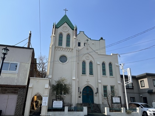 1873年(明治6年)にアメリカからメソジスト派の宣教師、M.C.ハリスが来日し、翌年から伝道を始めていて、プロテスタント教会では日本で3番めに古い教会なのだそうです。そのときは「函館美以教会」という名称でした。火事の多い函館の街で当初の聖堂は焼失していて、現存するのは1931年(昭和6年)に再建されたものです。1941年(昭和16年)にプロテスタントの教派の合流があって、現名称になっています。
