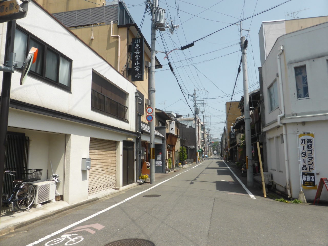 嶋原商店街は、東側にある西本願寺と西側の半分を占める旧花街「島原」を含めた、約600mほどの商店街で花屋町通りに面しています。昔からある老舗や町家をリノベーションされたお洒落なショップが共存したノスタルジックな商店街。行った時はたまたま(?)人通りがなく、ひっそりしていました。