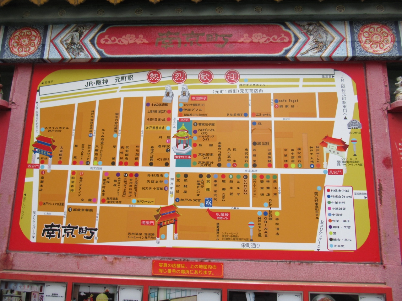 現在は、東西約270m、南北約110mのエリアに中央部に南京町広場があるほか、中華料理店、雑貨店、食材店などが連なっています。