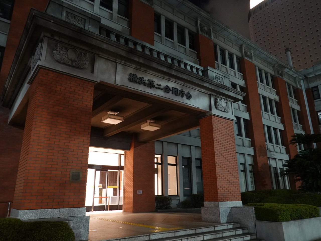 馬車道駅の真上、私たちが宿泊していた「横浜北仲ノット」のすぐ隣に「横浜第2合同庁舎」がありました。こちらの建物は大正15年に「横浜生糸検査所」として建設されたものを一度解体し、ファサードを復元する形で平成5年に再建されたということです。再建とはいえ重厚感は素晴らしく、圧倒されるような光景でした。