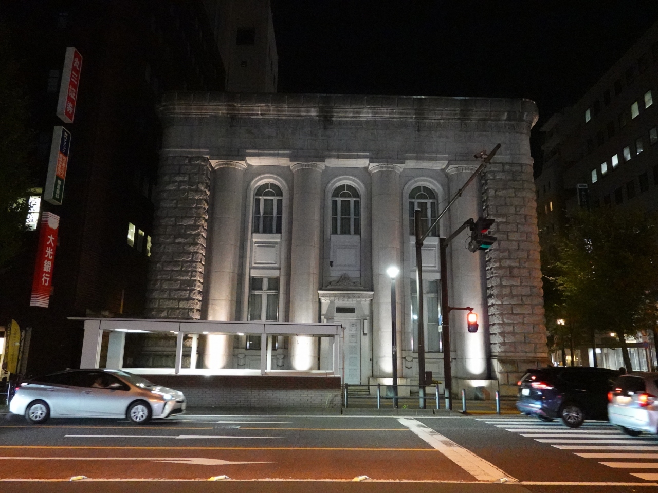 本町四丁目交差点の一画にある建物です。昭和4年に建てられた地上3階建ての歴史的建築物です。この界隈には大正末期から昭和初期に建てられた建物が点在しますが、その中では小さい部類に入ります。しかしながら、正面に配置された4本の円柱や、石造りでごつごつした壁など、他の歴史建築と異なる要素がいくつかあり、存在感は抜群でした。