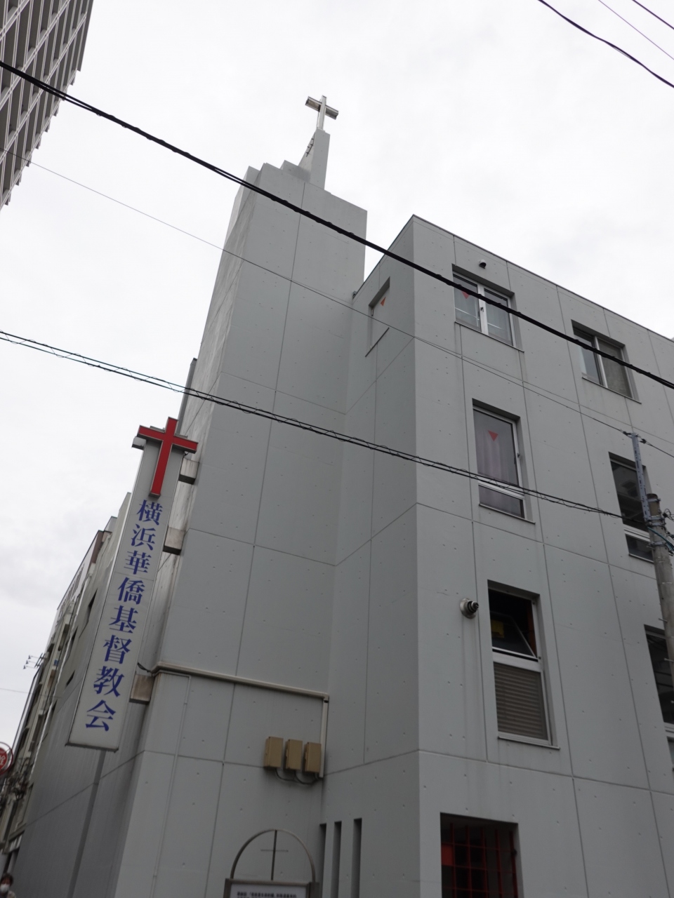 横浜華僑基督教会は、元町・中華街駅から徒歩1分ほど、中華街の北東端近い場所にあります。一見すると白い普通のビルで、壁面と塔屋にある十字架で教会と分かります。1950年代にアメリカ人宣教師によって拓かれたということです。観光客が足を運ぶ教会ではないように感じました。