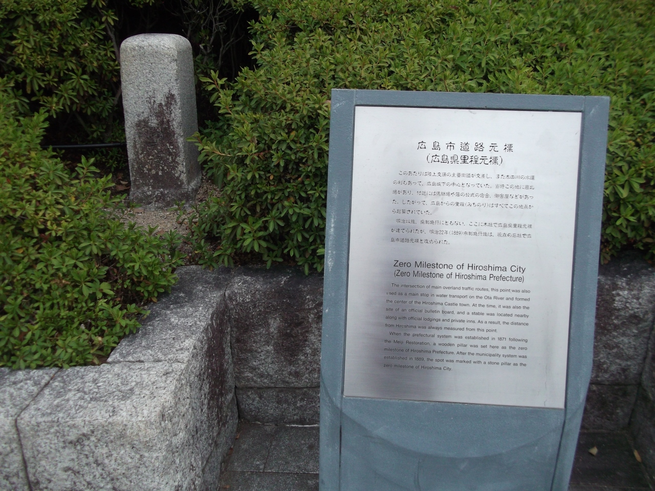 原爆ドームから元安橋に向かって2分ほど、橋のたもとにこの石碑がありました。植物に囲まれた中にあって最初は何かわかりませんでしたが、説明板を見て道路元標だとわかりました。主要街道が交差し水運にも恵まれた場所だったので、ここが広島の中心として選ばれたようです。説明板がないとそのまま通り過ぎてしまいそうです。