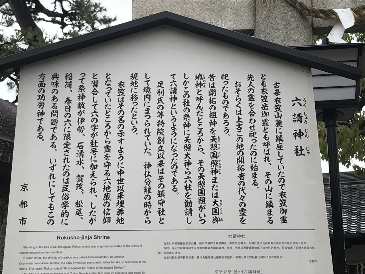 六請神社は、衣笠と呼ばれる地域にある神社です。起源は古く、延暦年間(782~806)に衣笠山の麓に建立されました。当時は衣笠御霊と呼ばれていました。室町時代になると3代将軍・足利義満によって等持院(足利家の菩提寺)の境内に勧請されました。明治になると神仏分離令により、等持院の東側に改めて建立されました。以後も「衣笠の産土神」として崇敬を受けているそうです。伊勢、石清水、賀茂、松尾、稻荷、春日の六大神をお祀りしている神社です。
