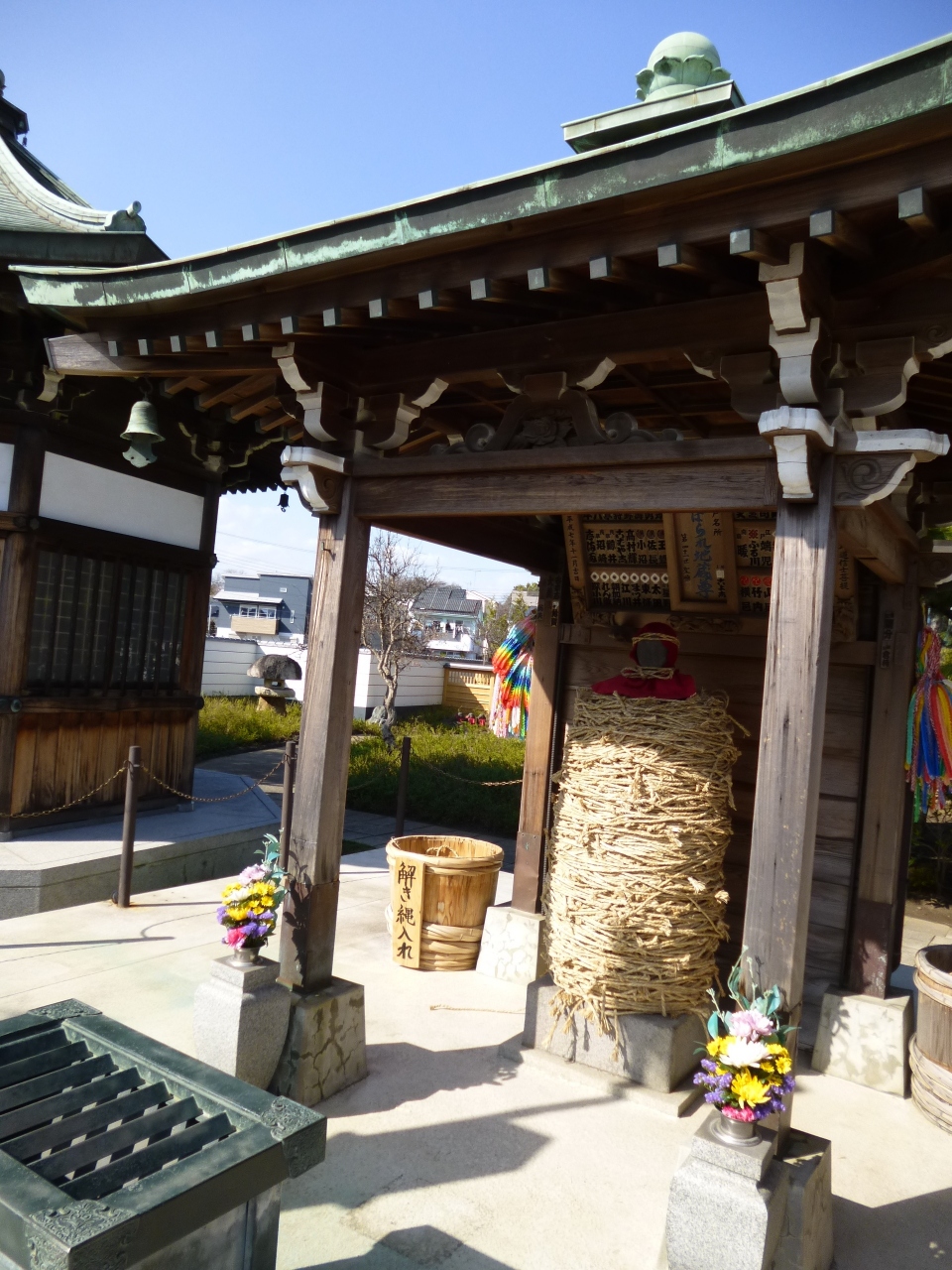 金町駅から北へ17分ほど歩いたとことろ、水元公園の手前にあるお寺です。立派な山門のお寺で、境内もゆったりとしています。山門をくぐると左手に本堂、正面に地蔵堂、しばられ地蔵、聖徳太子堂と並んでいます。創建は在原業平の時代にさかのぼる由緒あるお寺です。なんといっても目を引くのはしばられ地蔵で、祈願するときは地蔵尊を縄で縛り、成就したときには縄を解く地蔵尊です。多くの人の祈願の縄を身に纏っていらっしゃいました。