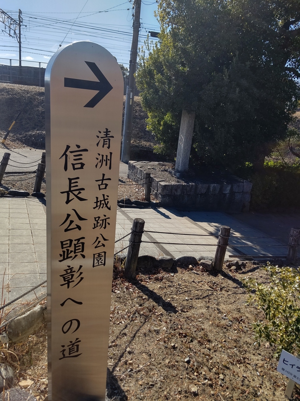 入口には『信長公顕彰への道』と書かれていて、公園内は小さいですが、信長公を祀るお社、織田信長公古城跡の石碑などありました。