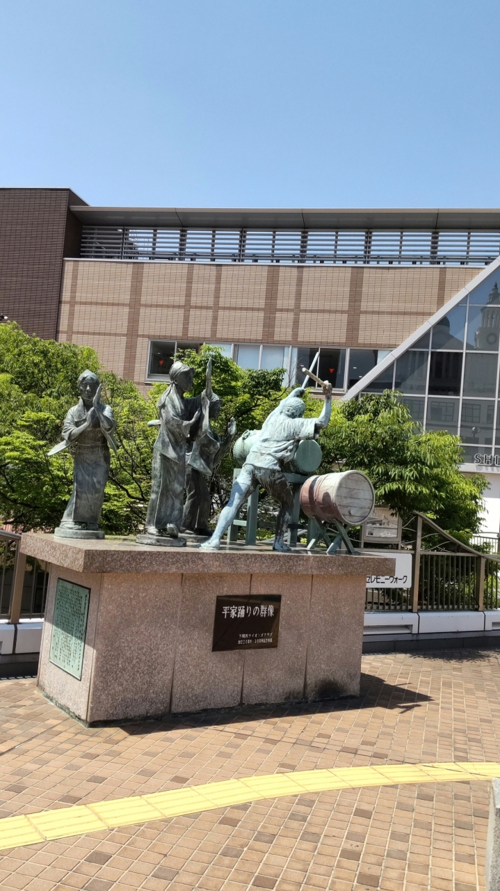 JR下関駅前のロータリーの上の歩道橋みたいな広い広場にある平家踊りの群像なる像です、シーモールや大丸下関店の眼の前にあります。壇ノ浦が近いからか平家の供養の踊りの為に置かれているのかよくわかりませんがあまり観光には使われない銅像です。