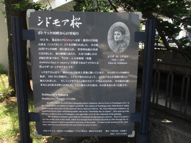 JR石川町から元町商店街を歩き中華街方面の谷戸橋のたもとに桜の木がありシドモア桜の説明板がありました。シドモア桜は元町通り商店街に並行して流れている堀川にあります。この桜はアメリカ人紀行作家のシドモアさんが1912年にワシントンへ友好の印として桜の苗木が贈られ、アメリカに移植した桜を再び日本に植樹されたそうです。日本とアメリカの友好の桜です。