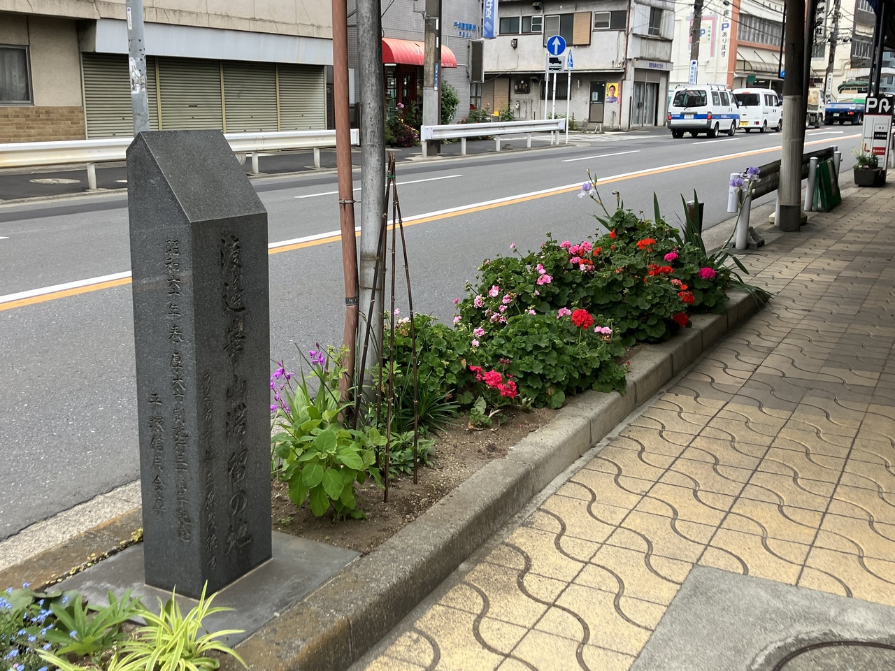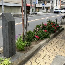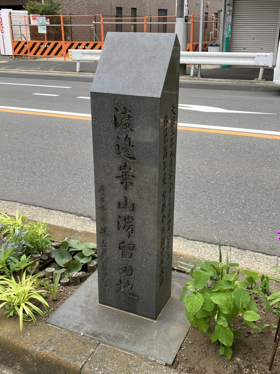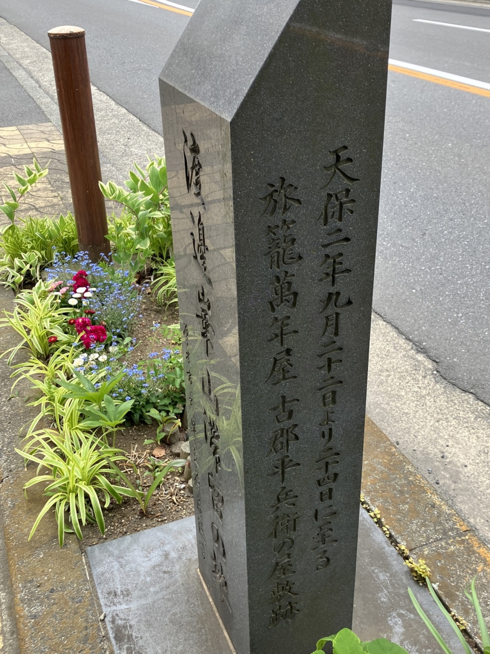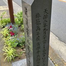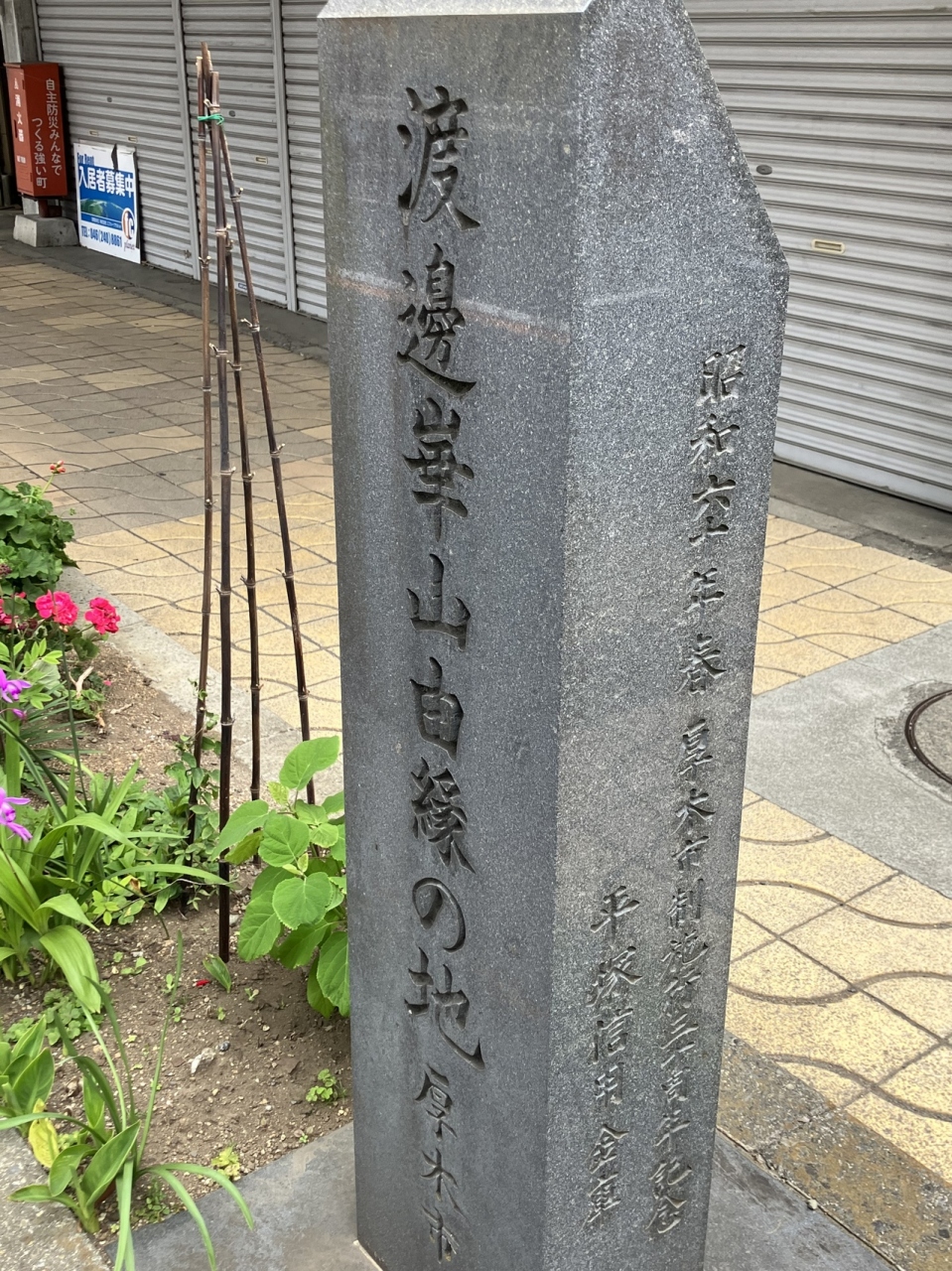 小田急線「本厚木駅」から徒歩で7分ほどです。「天王町通り」の「人形の岩崎」店舗前の歩道に碑が立っています。先日、NHK歴史番組「先人たちの底力 知恵泉」で渡辺華山が取り上げられ、厚木市にも華山が旅の途中に立ち寄ったことを思い出し、再訪しました。渡辺華山は田原藩家老と蘭学者、画家という多彩な才能をもつ人物で領民の生活安定のため献身的な活動をしました。しかし惜しくも「蛮社の獄」で捕らえられ自ら命を絶ちました。碑は天王町にかつてあった「万年屋」という宿に滞在した地に建てられています。