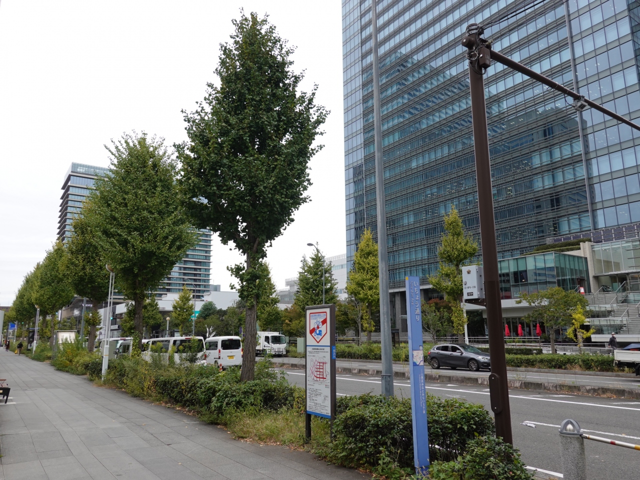 11月の初旬、街路樹のいちょうの葉がやや色付く程度で、期待していた紅葉にはほど遠い光景でした。あいにくの曇天もあり、道沿いのビルの無機質さだけが感じられ、少し残念な光景でした。