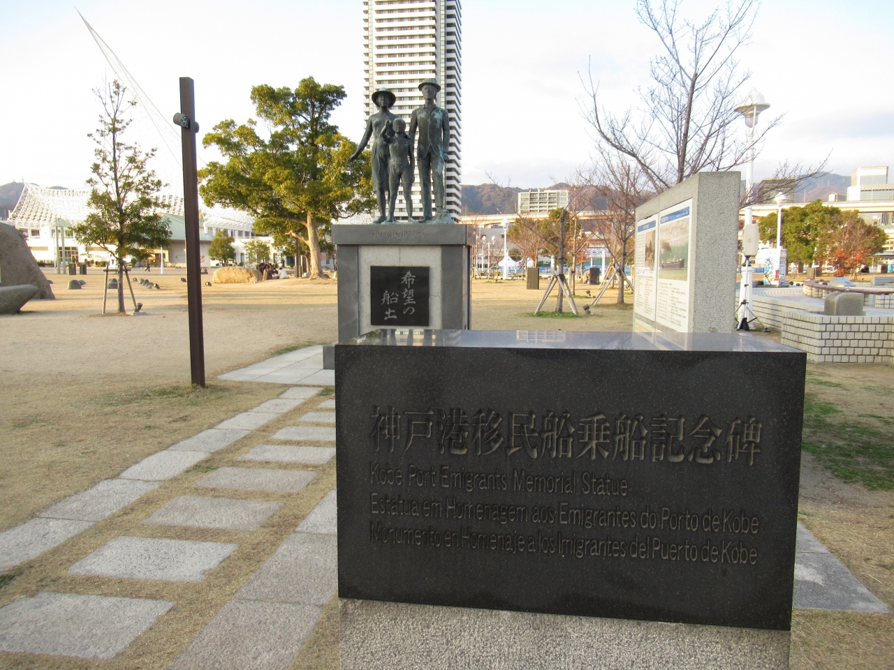 記念碑は、海を見つめ、船に乗り込もうとしている三人親子の移住家族をモデルにした銅像で、台座に「希望の船出」の文字が刻まれ、また、台座の脇には神戸港を出港する当時の笠戸丸の姿が再現されているそうです。