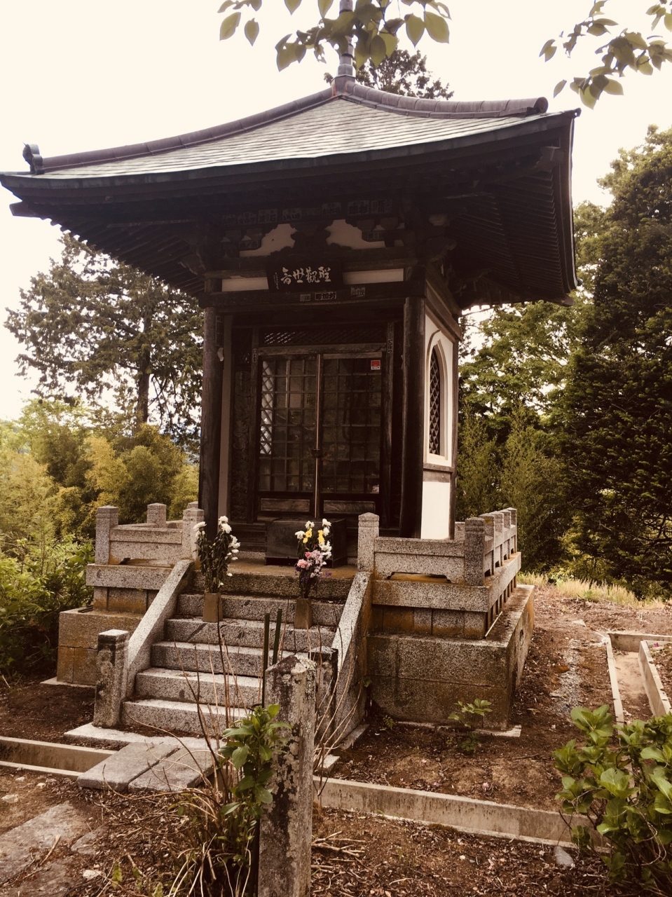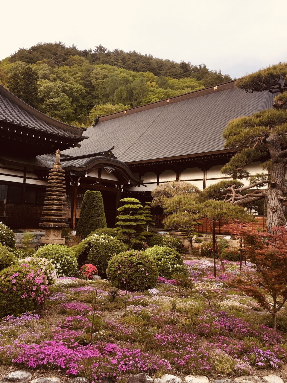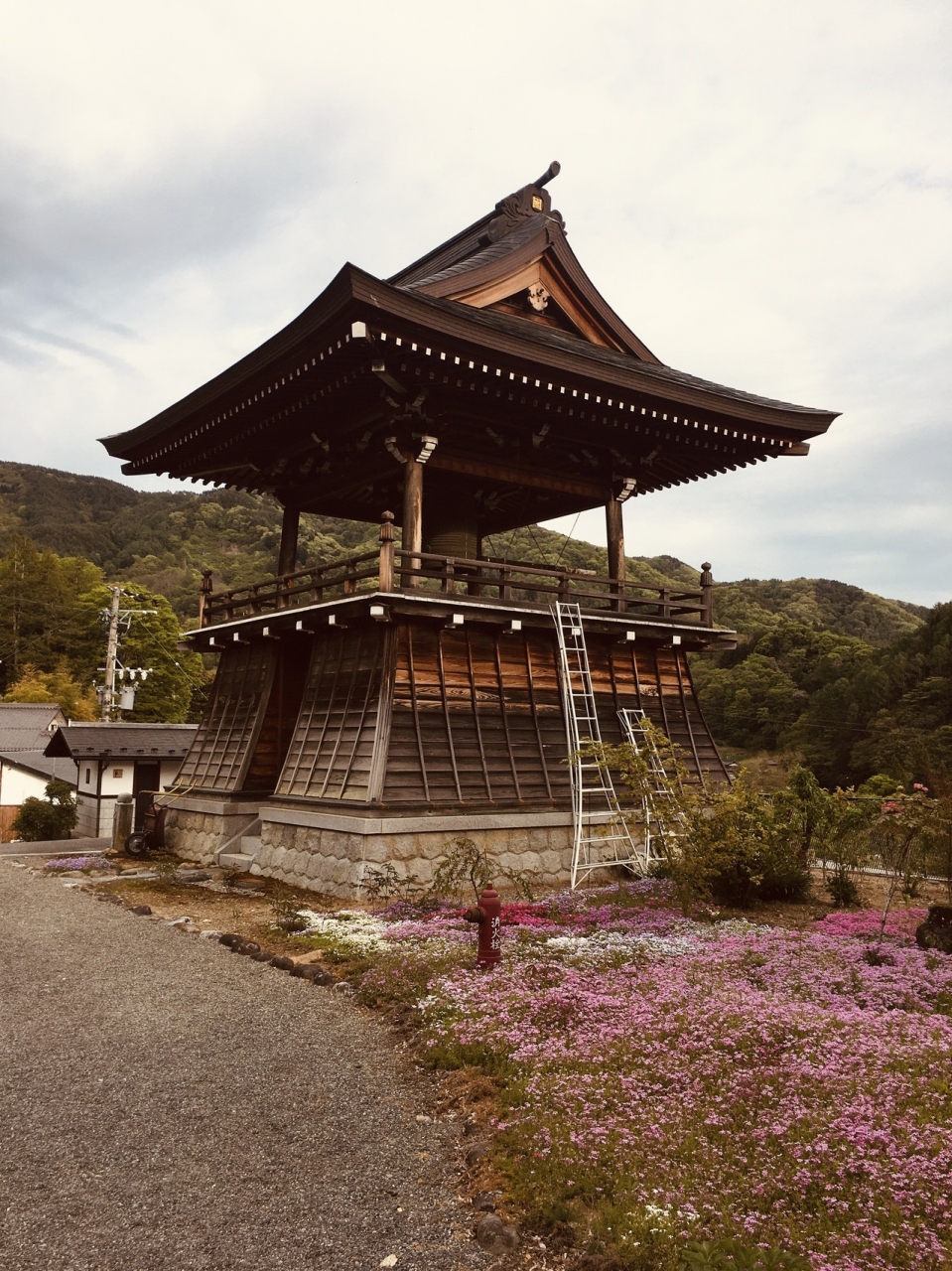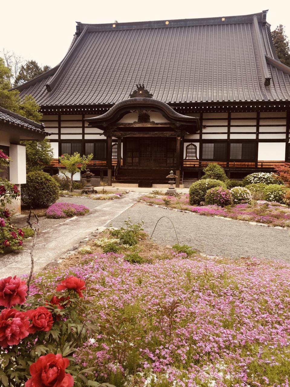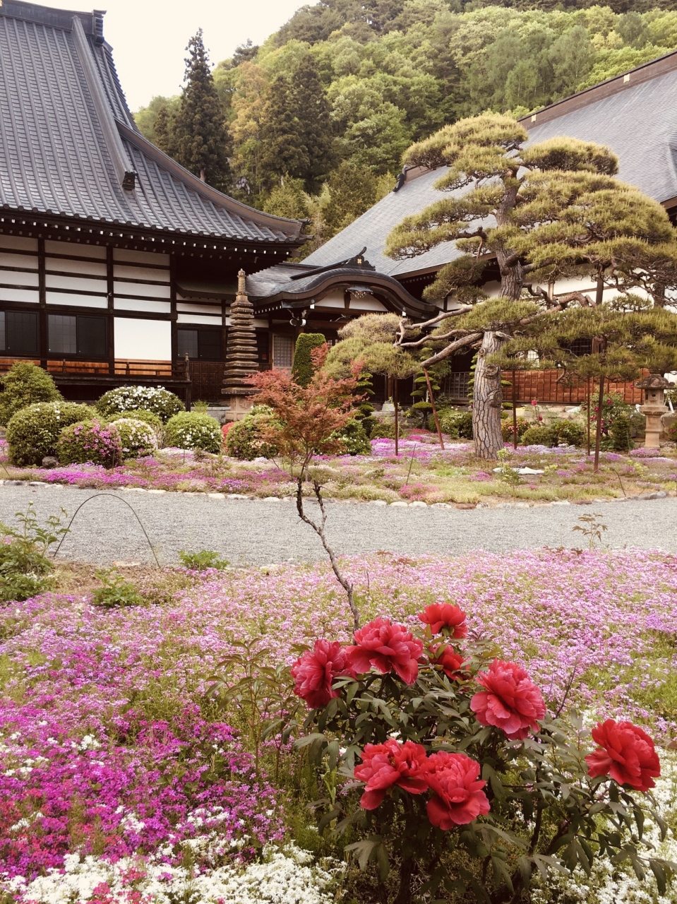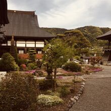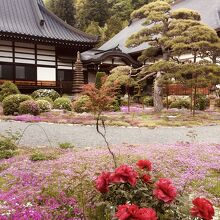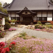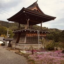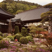 境内下に駐車場があり、境内には階段か坂道を上がることとなります。大きな本堂の前には、庭園が広がり、花が見事に咲いていました。鐘も大きく、蔵のような建物の横には、お堂が入り、高台の墓地に繋がります。赤とピンクの花が見事でした。