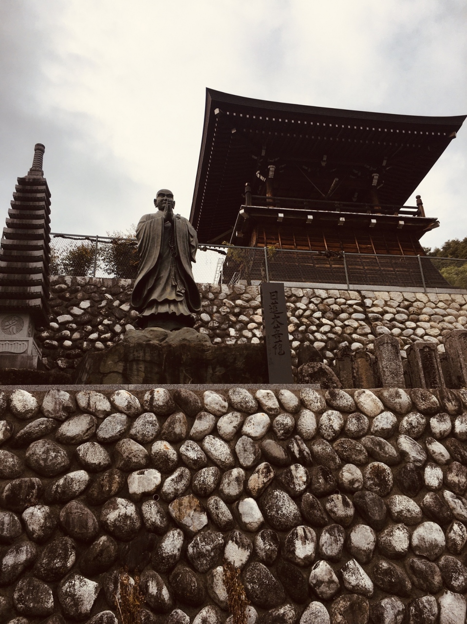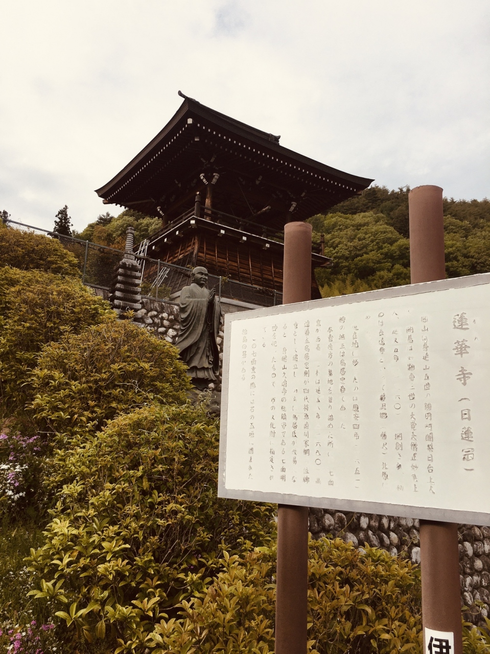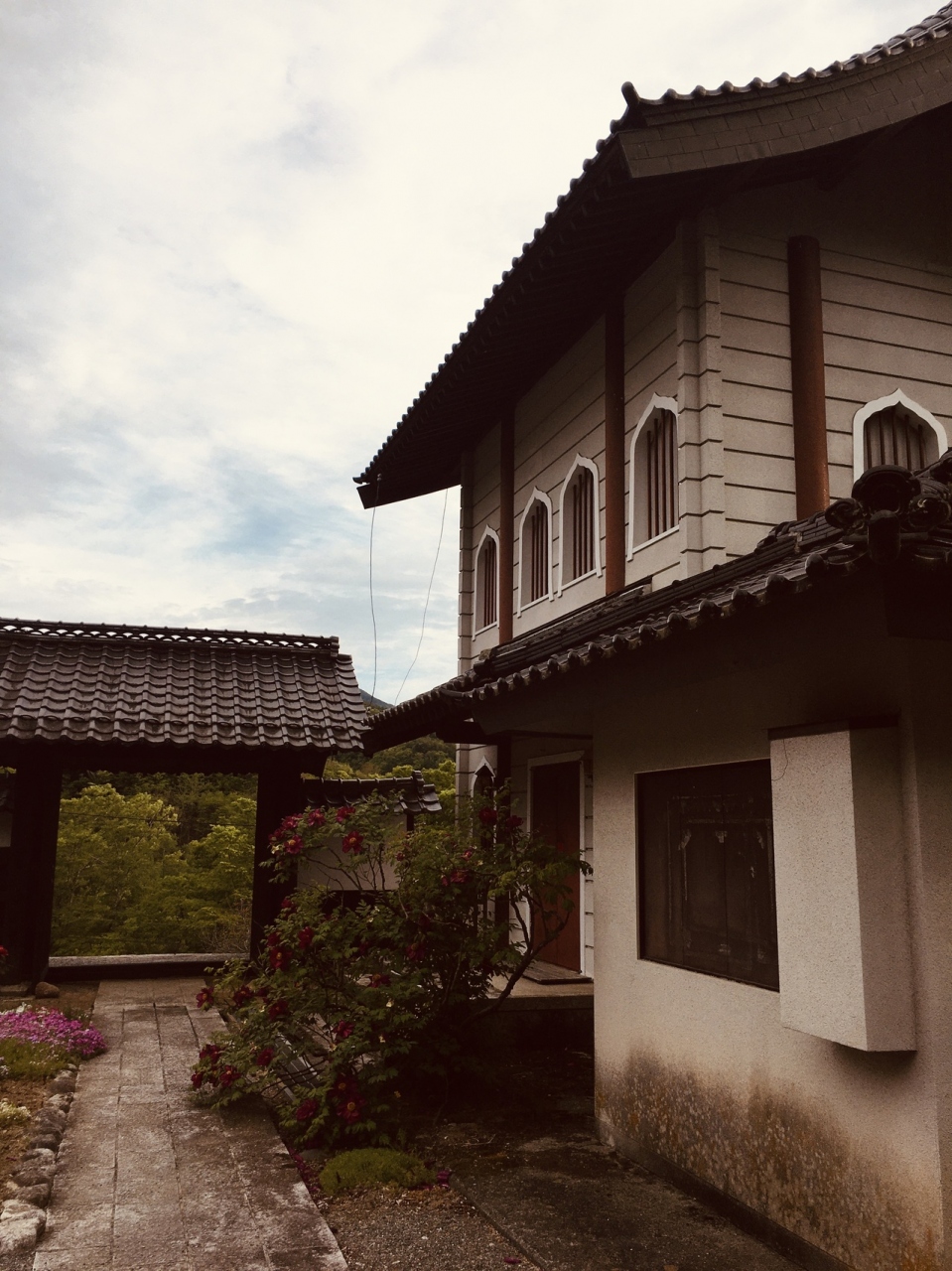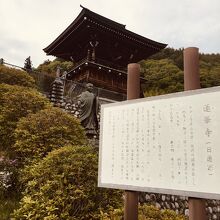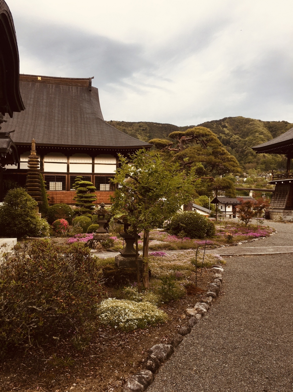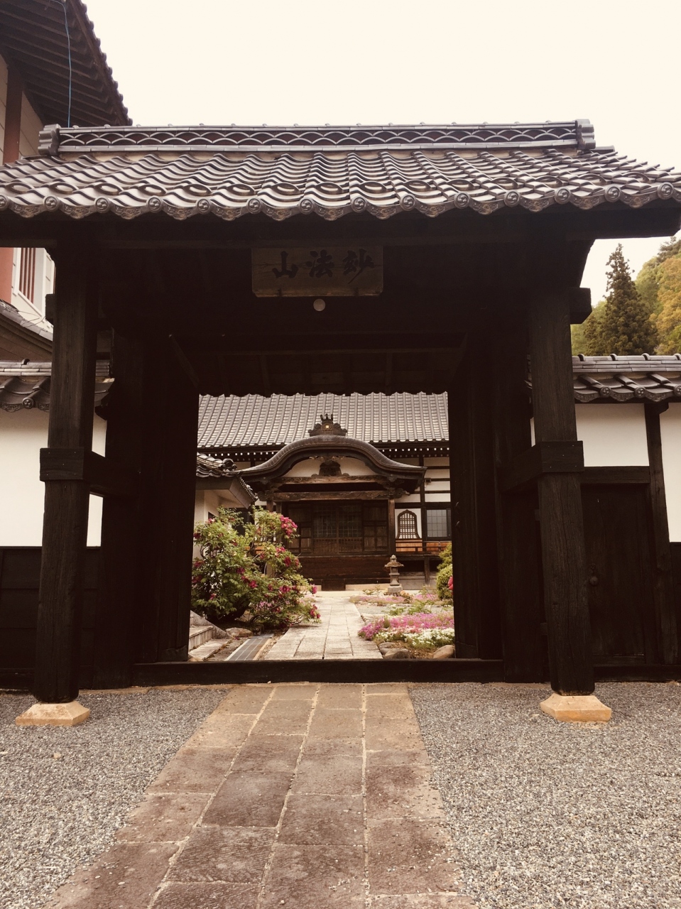 境内下に駐車場があり、境内には階段か坂道を上がることとなります。大きな本堂の前には、庭園が広がり、花が見事に咲いていました。鐘も大きく、蔵のような建物の横には、お堂が入り、高台の墓地に繋がります。赤とピンクの花が見事でした。