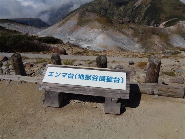 立山室堂から少し歩いた場所にあります.本来は地獄谷という温泉が噴き出ている場所へ下りて行く歩道があるのですが,ガスが発生しているために立入禁止になっていました.そのため,地獄谷を見るには,エンマ台から見下ろすしかありません.エンマ台には火山ガス情報ステーションがあり,ガス濃度が高くなったときには警報が鳴るようになっているようでした.エンマ台からの眺めはなかなかの絶景です.少し時間がかかりますが,時間に余裕がある場合には立ち寄られることをおすすめしたい場所です.