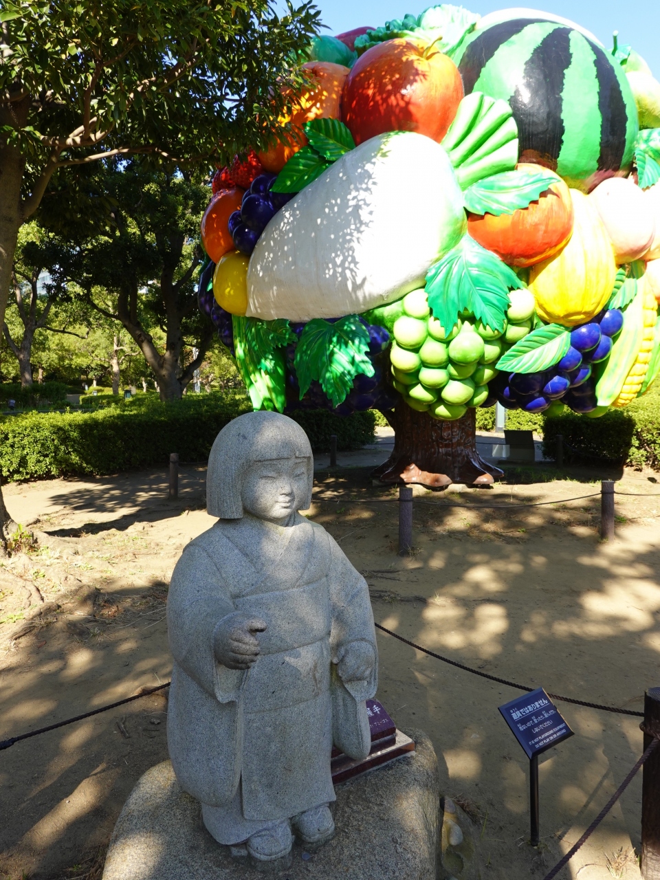 「リマちゃんと握手」は、臨港パークの海に近いエリアにあります。小柄な和服の女の子のモノトーンの像です。すぐ近くには、カラフルで華やかな「フルーツツリー」の姿があります。対照的とも思えるこの2つのモニュメントと像をあえて近くに配置したのは何か意味があったのかと、ふと興味深く思いました。