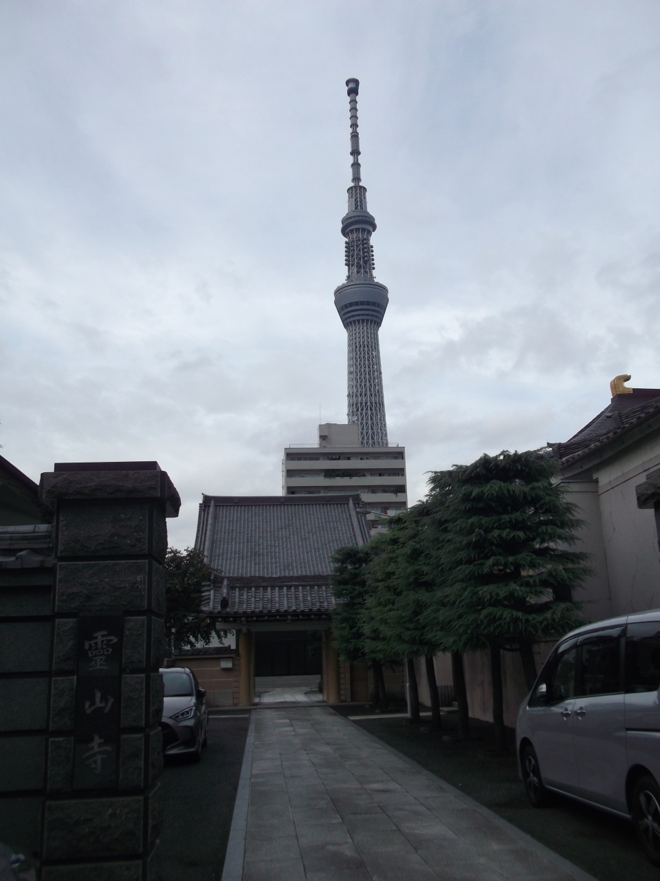 錦糸町駅北口を出て歩いて12分ほど、墨田区横川1丁目にある浄土宗の寺院です。山門から入ると、まっすぐに延びた平石の参道の先に白壁の映えて見える本堂がありました。正面から眺めると背景にスカイツリーが入り、ここならではの景観が広がって見えました。
