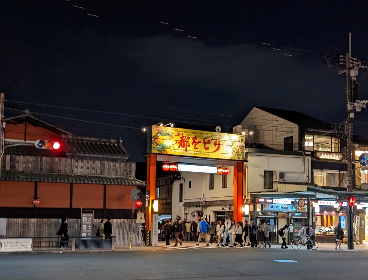 八坂神社の西楼門前から、四条通りを川端通りまでの、八坂神社の参道の両脇の商店街です。