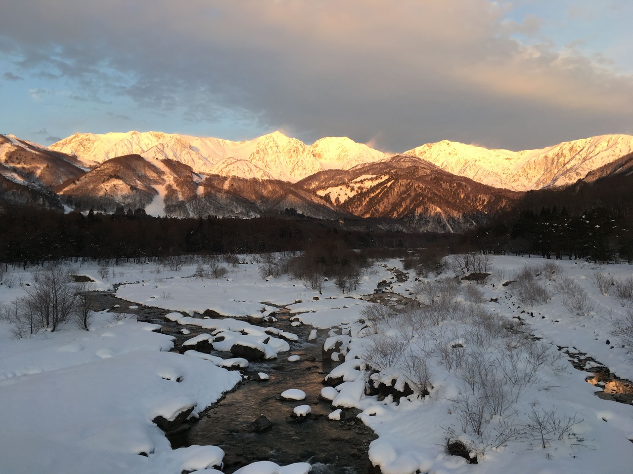 八方の宿のあるあたりからは徒歩10分くらいの場所です。松川と白馬三山始め、白馬の山並みがよく見えます。モルゲンロート を見ようと朝早くからたくさんの人が集まっていました。ふゆは橋の上は凍っているので十分注意が必要です。