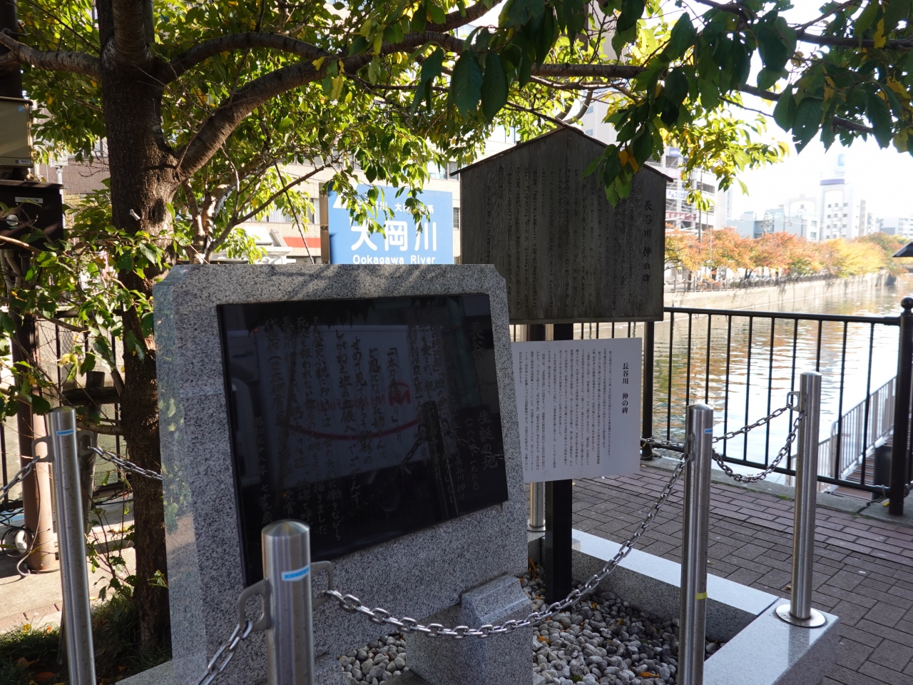 長谷川伸は、1884年に横浜市日ノ出町で生まれた小説家です。その生誕の地を記す石碑と高札が、長者橋の南西詰めにあります。史跡は大岡川を背景にするように設置されており、川沿いに植えられた木々の葉が色づき始め、とても良い雰囲気を作り出していました。