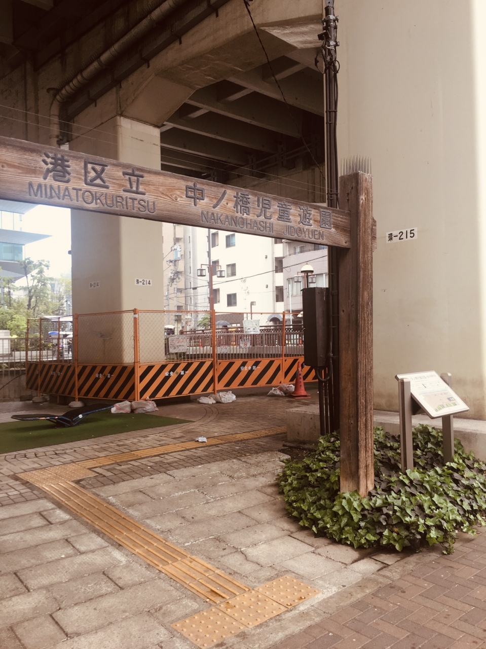 中の橋に隣接したミニ公園。上は首都高速道路が走っているので,暗めの雰囲気で、横には川が流れていますが綺麗な川ではないです。トイレがありました。あまり遊ぶところがないような感じに見えました。訪問時工事していました。