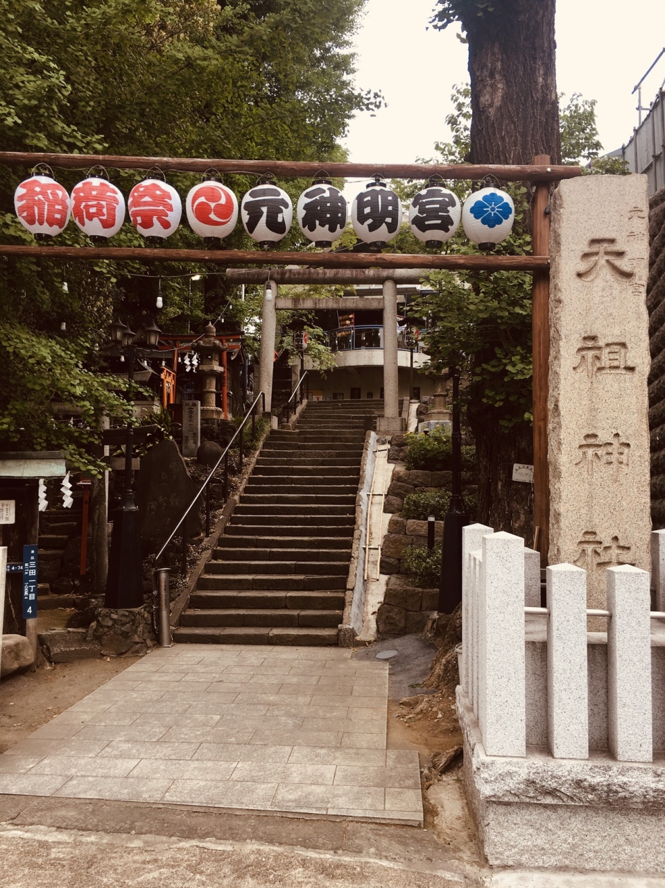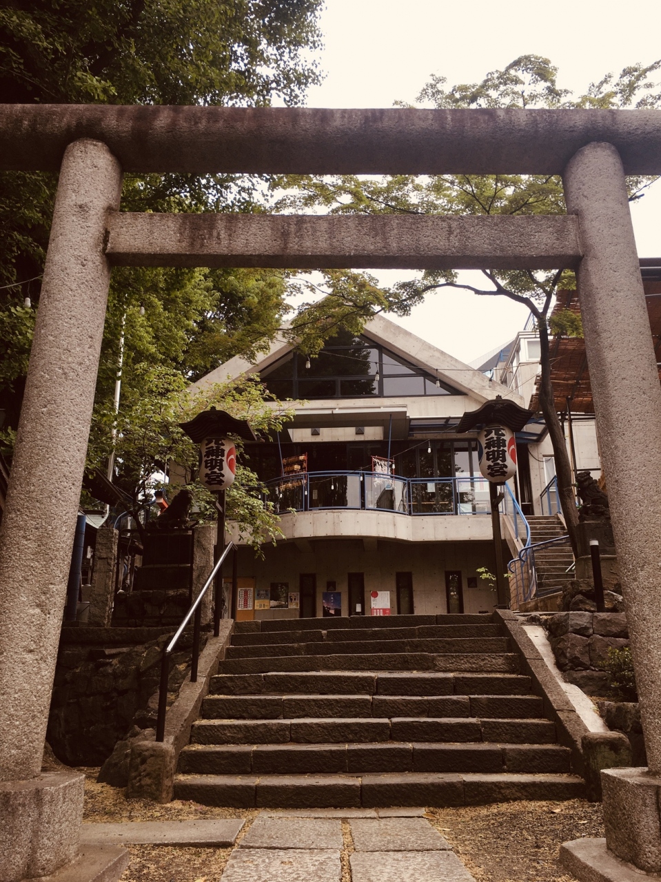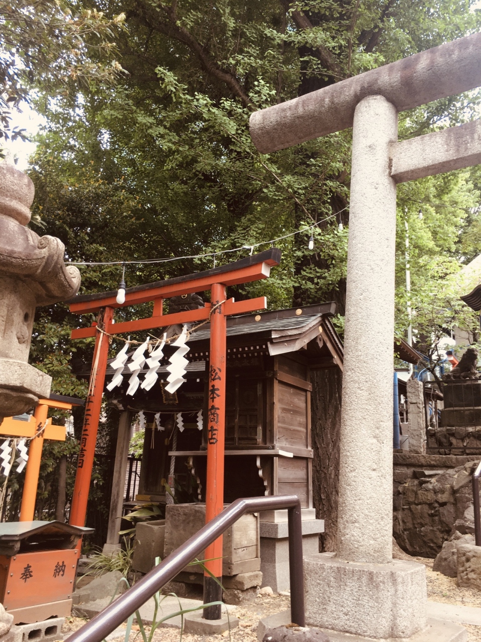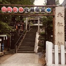 神明坂道沿いにありました。階段を上がると鳥居があり、境内に鳥居がいくつかありました。灯篭と古い祠もありました。社殿は三角形で階段を上がり参拝することとなります。おみくじがたくさんあり,裸電球が目立っていました。
